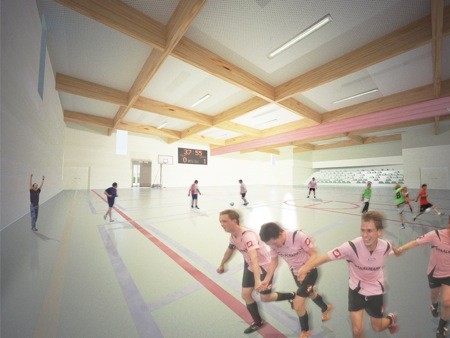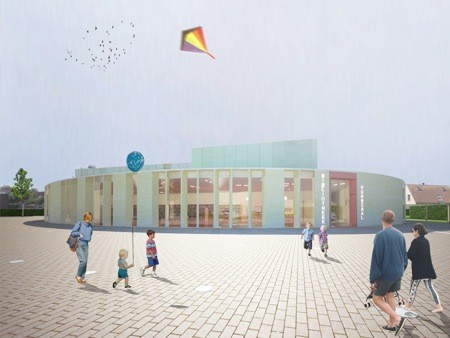 Multifunctioneel gebouw met kinderdagverblijf en kleine bibliotheek. Het gebouw meet ongeveer 2.100 m² en strekt zich uit over 2 verdiepingen. Het ontwerp bestrijkt een belangrijk deel van het terrein en om het geheel zo compact mogelijk te houden, werd het gebouw gecentreerd op het plein.