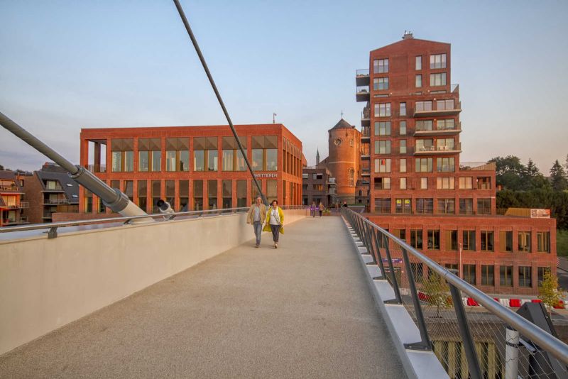 Wie langs de Schelde richting Wetteren fietst, ziet het krachtige silhouet van de Sint-Gertrudiskerk opduiken, met haar robuuste middenschip en hoge toren. Die rode baksteen komt terug in de volumes van het nieuwe stadshart. Het rijmt op het oude centrum met zijn loggia’s en zadeldaken, maar is onmiskenbaar een hedendaagse aanvulling. In een enkel krachtig en helder gebaar is daar ook de nieuwe fietsbrug, ontworpen door ZJA. Hij bestaat uit een licht achterover hellende, witte stalen pyloon, recht tegenover de kerktoren en bijna even hoog. Een rank silhouet dat naar boven nog versmalt. Vier tuikabels dragen het minimale fietsdek dat de hoge kade in het nieuwe stadshart aantipt zoals een scheepsloopplank de kade.
