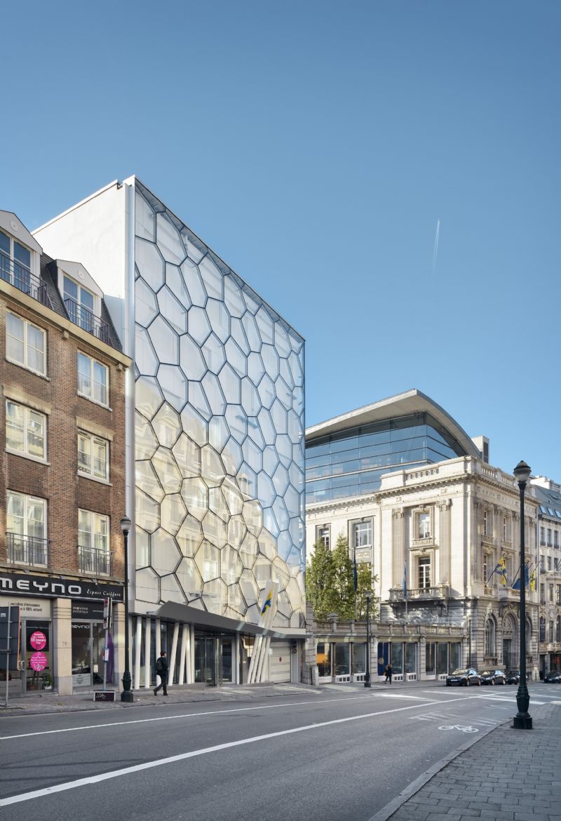 Voor deze nieuwe zetel van het Franstalig Parlement te Brussel werd een sober volume uitgewerkt, met rondom een gevel gematerialiseerd door een voronoïdenpatroon als uitdrukking, dat een wiskundige formule hanteert die dicht bij een fractieverdeling aanleunt en toelaat, om op basis van vijf onderscheiden elementen, oneindig veel varianten te combineren.