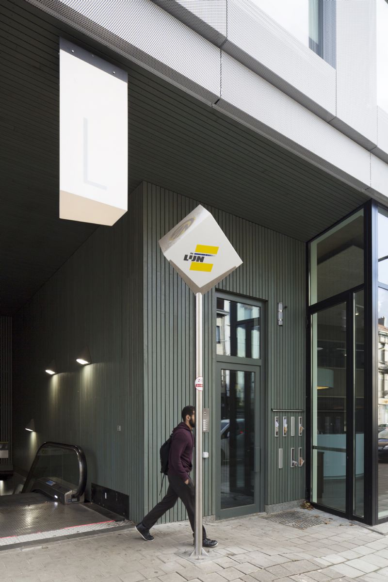 In Antwerpen ontwierp architectenbureau HUB een multifunctionele constructie, Gebouw Zegel. De begane grond en de mezzanine verdieping van het gebouw vormen de toegang tot de premetro ‘Zegel’ en een politieonthaal. De eerste verdieping werd ingericht als politiewijkkantoor en de bovenliggende verdiepingen bestaan uit zes huurwoningen. De huurwoningen hebben diverse typologieën, afhankelijk van hun positie op het hoekperceel. Het gebouw hangt over de ondergrondse trappenpartijen die de metrohalte bedienen. De betonnen wanden kruisen elkaar volgens de hoekverdraaiing van het perceel. De hoek van het gebouw wordt op de begane grond gebruikt om de premetro te ontsluiten.