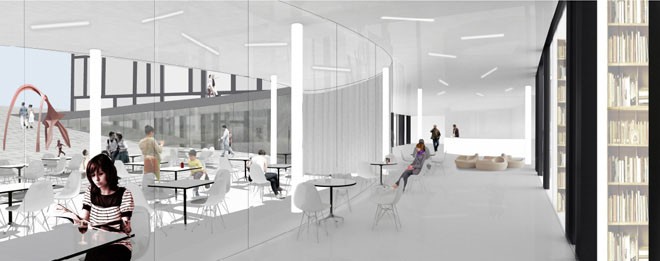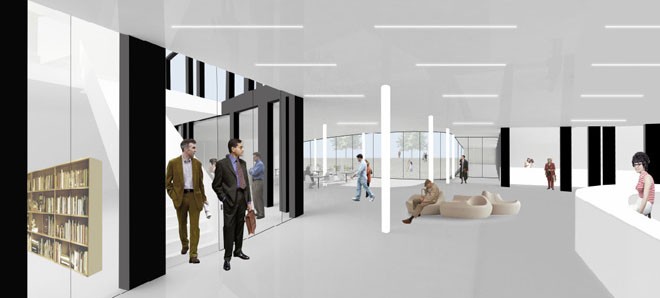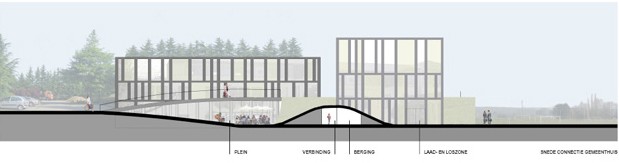 Nieuwbouw van een gemeenschapscentrum dat verbonden is met het gemeentehuis. Polyvalente zaal voor theater en bijeenkomsten allerhande, keuken, café, bibliotheek, bureaus voor de administratie cultuur, leslokalen voor de academie,opslagruimtes. Een L-vormige constellatie van twee hogere volumes die oprijzen uit een breed basisvolume. Het dak van dat basisvolume begint op de begane grond en loopt op naar achter toe, terwijl het landschap intussen afhelt. Zo komt dat uitgestrekte gelijkvloerse bouwvolume geleidelijk aan uit de helling te voorschijn. Verschillende circuits functioneren onafhankelijk van elkaar (en afsluitbaar van elkaar) op verschillende tijdstippen. Grote delen van het gebouw dienen meer dan één functie. Er zijn veel tussenruimtes, passages, informele ruimtes, plekken om rond te hangen.