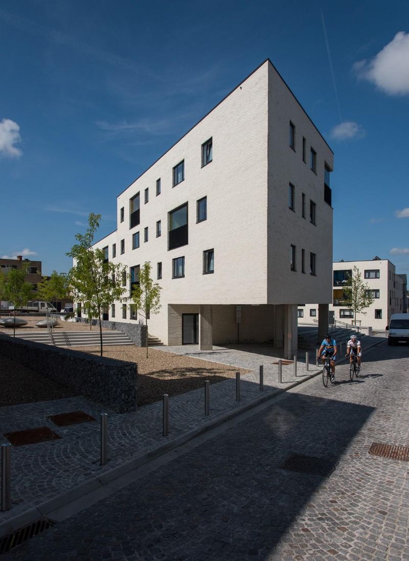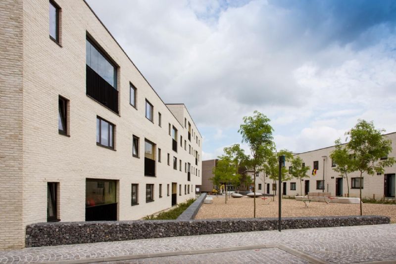 Nieuwbouw sociaal huisvestingsproject van 38 appartementen en 7 woningen met ondergrondse parking en organisatie van de publieke buitenruimte in het centrum van Liedekerke.