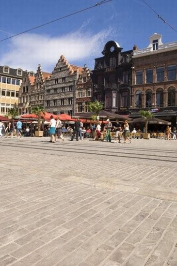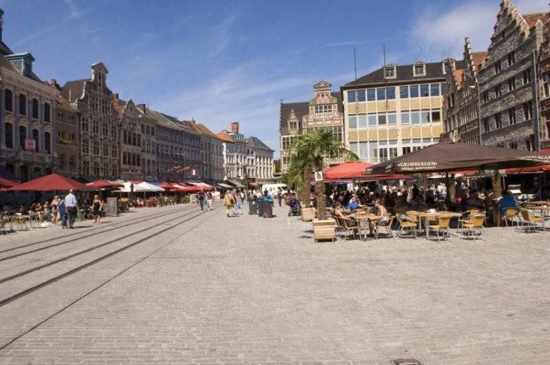 Heraanleg van de Korenmarkt in het centrum van Gent met natuursteen Kandla White Beige.
