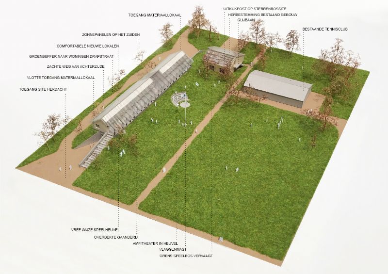 Op de Sterrenbossite in Narareth wordt een nieuwe jeugdinfrastrctuur en omgevingsaanleg gerealiseerd voor de lokale KSA en speelpleinwerking. De opbouw in CLT levert ruime en aangename jeugdlokalen op. Het ontwerp speelt in op de werking en de noden van een jeugdbeweging. Het maaiveld wordt opgehoogd tot het niveau van deze buitenruimte, waardoor de Sterrenbossite op een natuurlijke en aantrekkelijke manier begrensd wordt. Door de heuvel en het gebouw wordt de site meer gedefinieerd, en door de toevoeging van reliëf kan de site op verschillende manieren beleefd en gebruikt worden. Dit reliëf zet aan tot spelen, uitkijken, er wordt een klein amfitheater in de heuvel ingewerkt, etc.