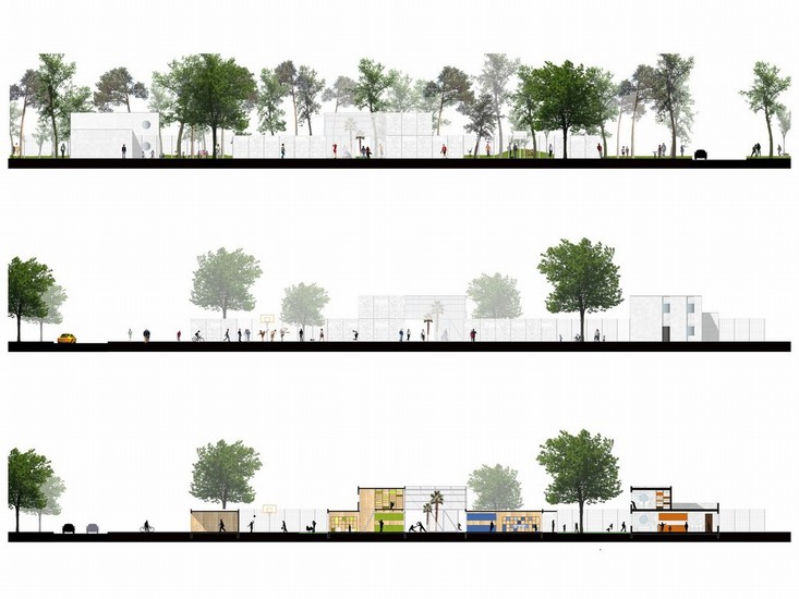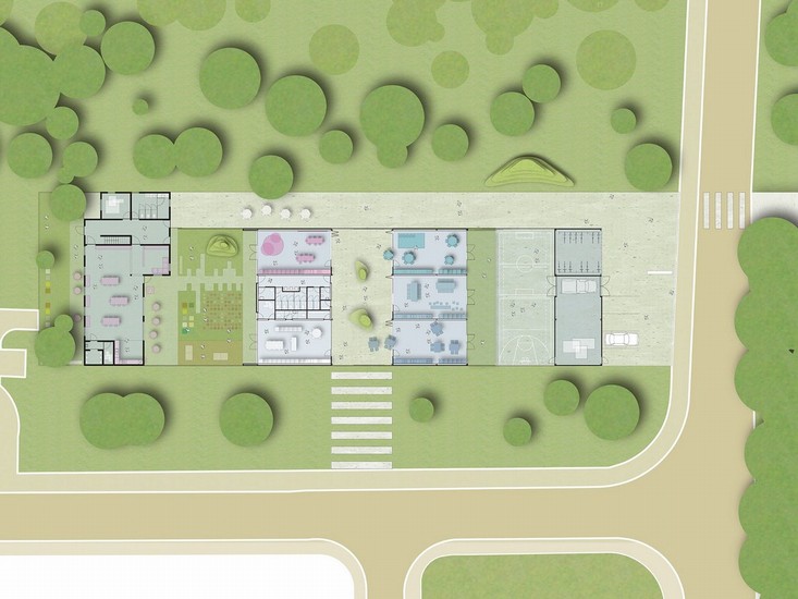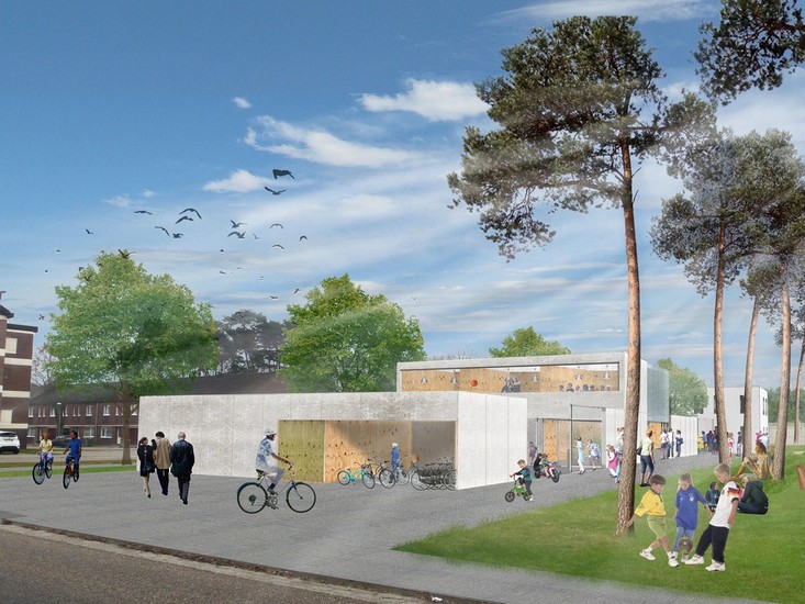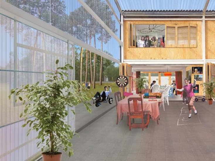 Het jongerencentrum is opgebouwd uit een eenvoudige constructie van stalen kolommen en balken, stalen dakplaten en een groendak. Het resultaat is een robuust maar transparant onderkomen voor de jongeren dat voor de bewoners van de omliggende woonwijk tevens fungeert als poort naar het parkbos.
