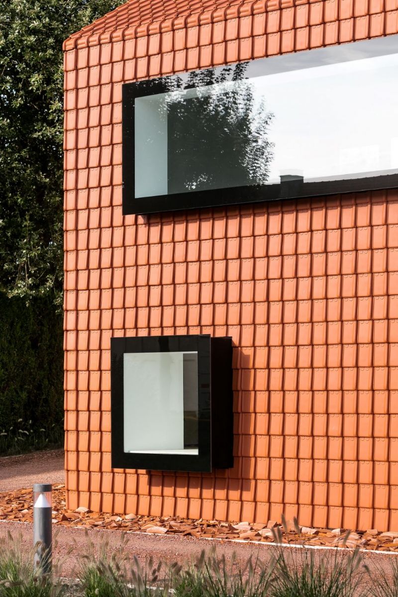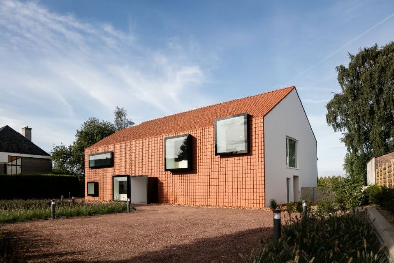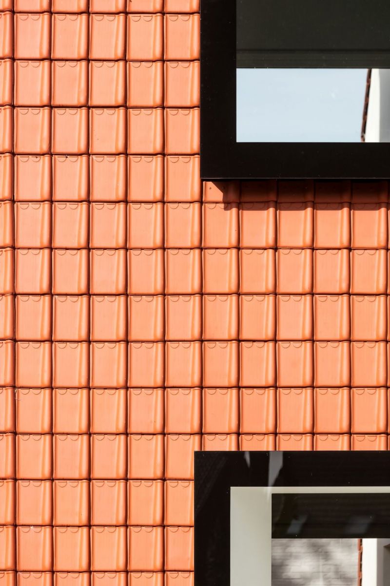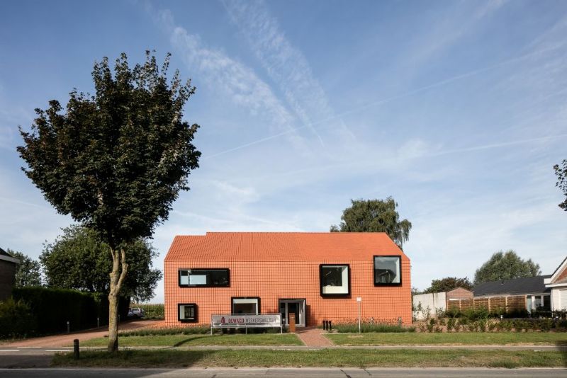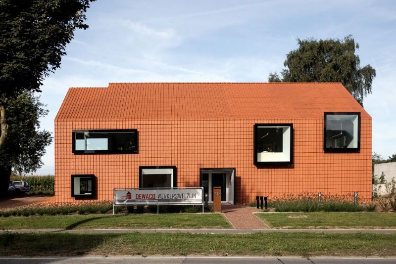 Een verouderde rijkswachtkazerne in Denderleeuw is omgebouwd tot gloednieuw kantoorgebouw voor een sociale huisvestingsmaatschappij. Vooral de typologie met hellend dak en de vuurrode uitstraling van het pand springen in het oog.