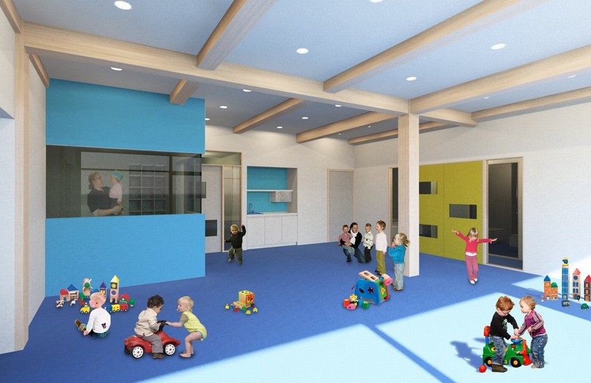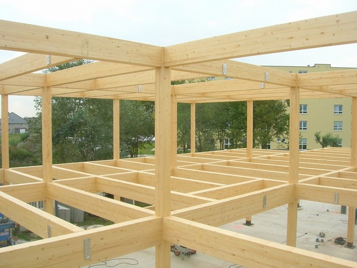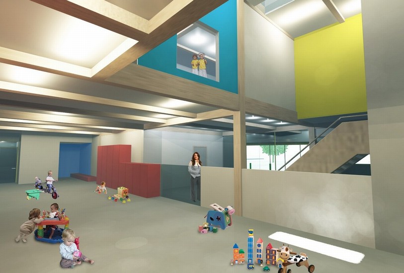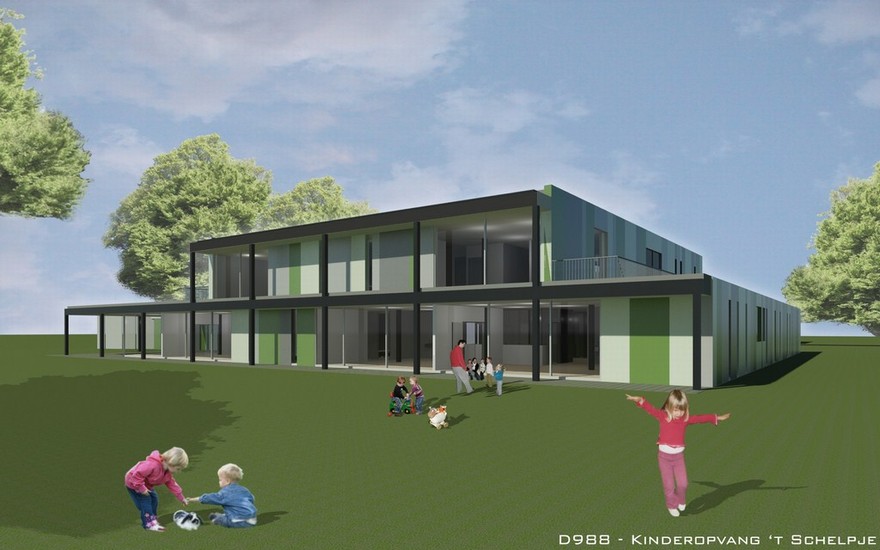 Het kinderdagverblijf heeft een driehoekige vorm dat werd opgedeeld in een rasterstructuur van 5.5 x 5.5m. waarbij de kruispunten fungeren als draagstructuur van het gebouw. Deze houten structuur is opgebouwd uit gelamelleerde spanten die volgens het Sherpa-systeem werden gemonteerd.
