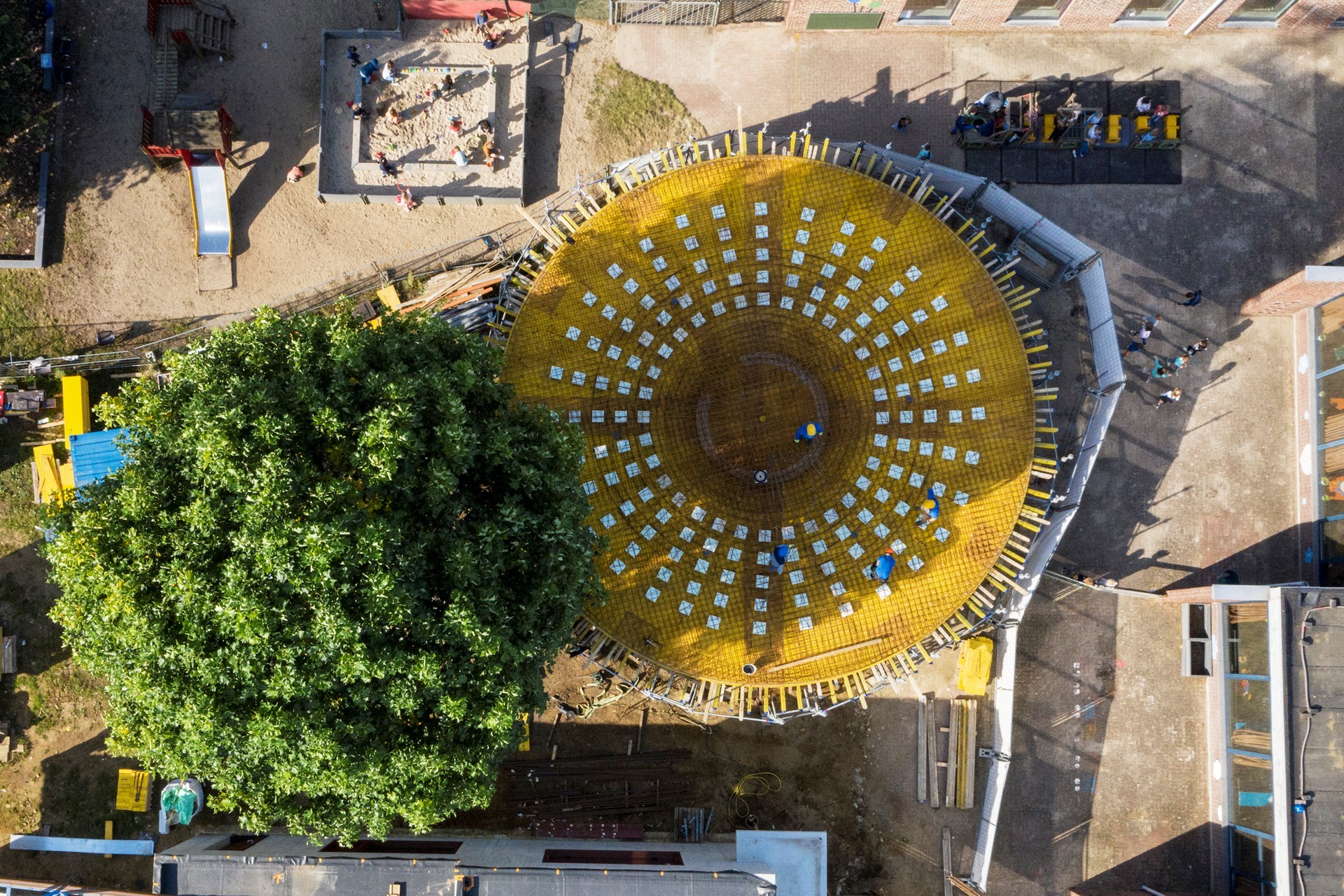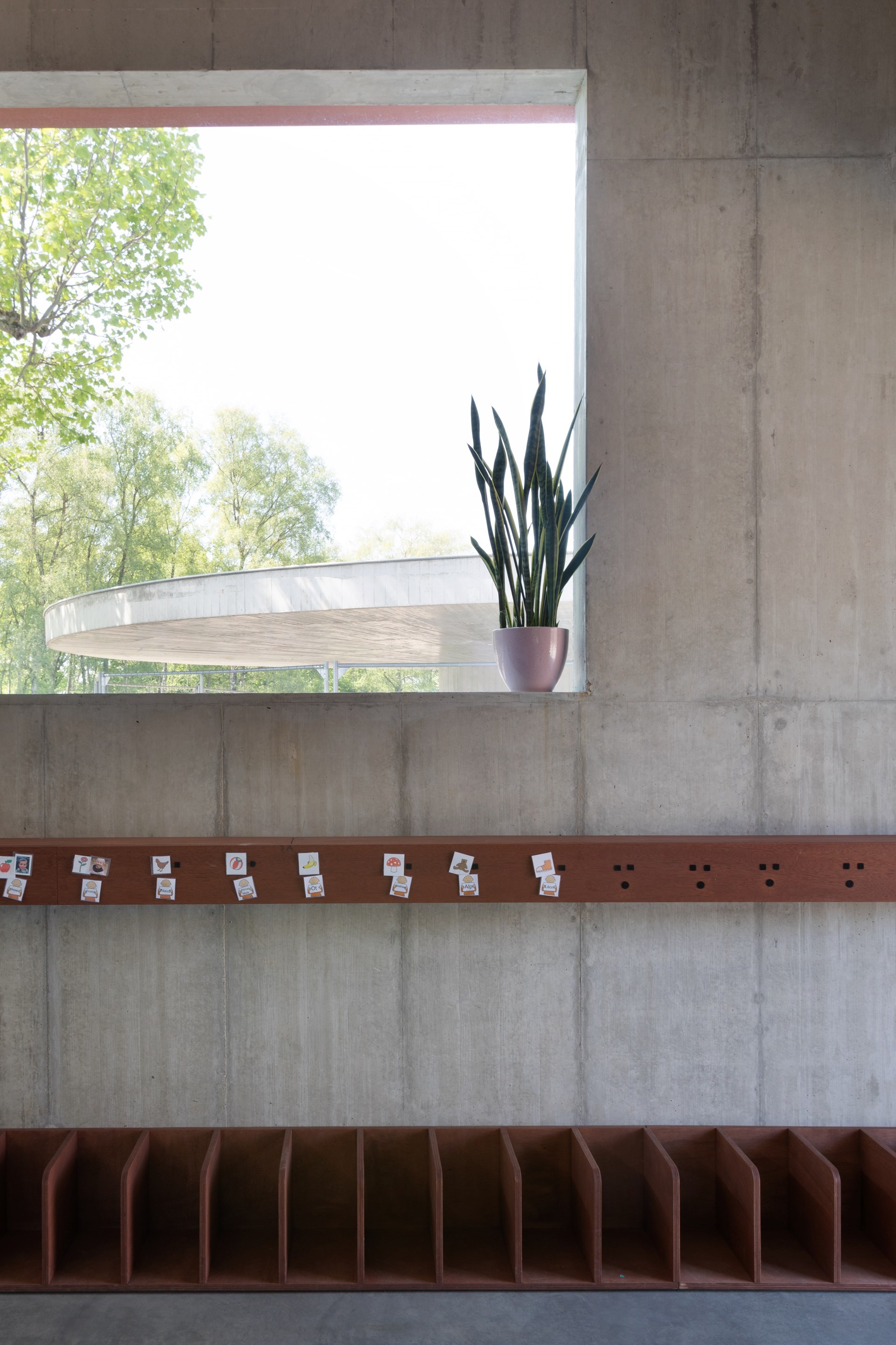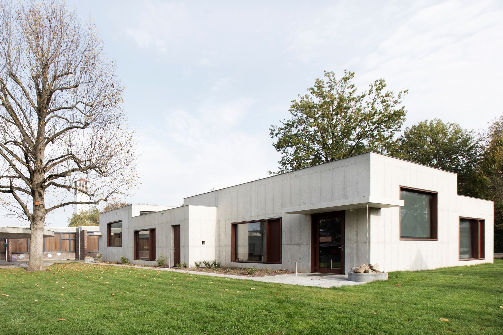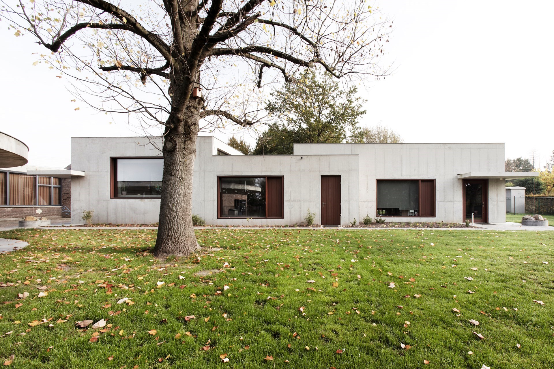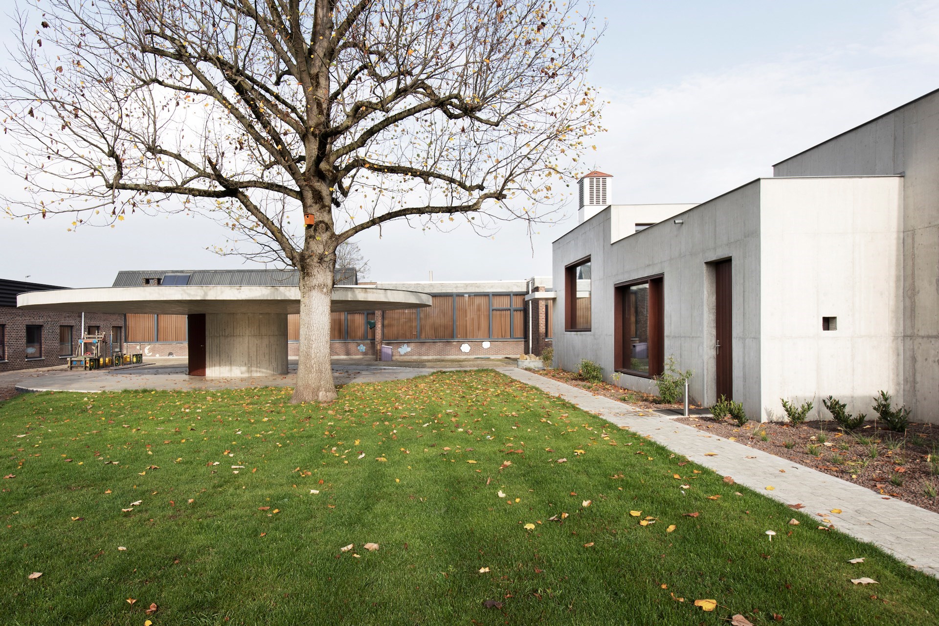In het dorpscentrum van het Limburgse Boekt realiseerde BOT architektuurcollectief vier nieuwe kleuterklassen als aanvulling op de bestaande kleuterschool. De massieve en compacte nieuwbouw in zichtbeton werd loodrecht ingeplant ten opzichte van het bestaande gebouw en brengt de school in relatie met het openbaar domein.