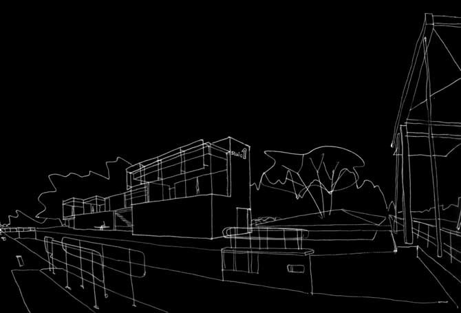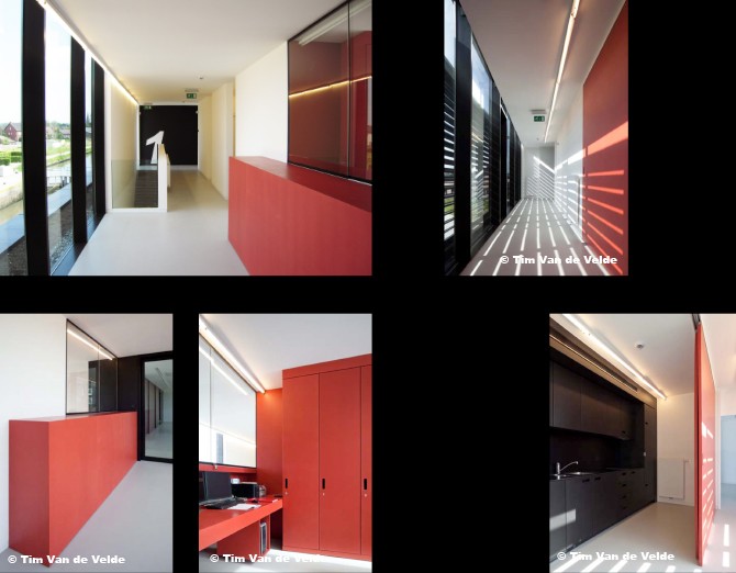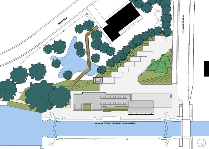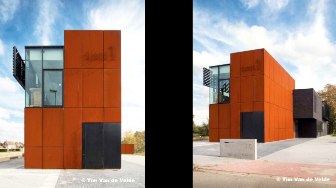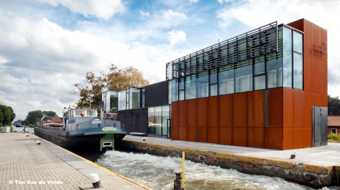 Het programma voorziet een centraal bedieningsgebouw voor de sluis 1 en 11 bruggen op het kanaal. Daarnaast worden er ook bureel- en werkruimte voor het personeel van nv De Scheepvaart in ondergebracht. Context: - de sluis en brug - het terrein is driehoekig en omsloten door 2 straten en het kanaal - het terrein is tweeledig: met aan het kanaal een 'leeg' terrein met verspreid enkele kleine gebouwtjes aansluitend en achterliggend een lager gelegen terrein met de conciërgewoning en een groene buffer - er is een duidelijke lengterichting vanwege het kanaal Uitgangspunten - prioriteiten: - de hoofdfunctie van het gebouw is de bedieningsruimte - deze bedieningsruimte heeft nood aan visueel contact met de brug en de sluis, zowel stroomopwaarts als afwaarts van het kanaal - alle functies van het gebouw hebben te maken met het kanaal, dus best ook aangrenzend - deze functies vereisen geen relatie met de achtergelegen straat (Zuiderdijk) met woningen - centrale éénduidige circulatie en groeperen van functies om te komen tot een eenvoudige en klare indeling Materialen: - weervaste staalplaten voor de bedieningsruimte, als reminiscentie naar het staal van de sluis, de brug, de boten, ... - baksteen voor de overige gavels - thermische isolatie in muren en daken volgens EPB-regelgeving - aluminium ramen met superisolerend en zonwerend glas - vaste zonwering met lamellen - zichtbaar binnenmetselwerk in betonblokken voor het gelijkvloers - groendaken, de andere gewone platte daken voor de regenwaterrecuperatie Energiegebruik: Fotofoltaische zonnepanelen op het dak, helpen het gebouw in haar eigen elektriciteitsgebruik. Door regenwaterrecuperatie wordt een regenwaterput van 15.000L gevoed, die via een pomp de toiletten, uitgietbak en kraantjes voor buitengebruik en reiniging van de wagens bediend.