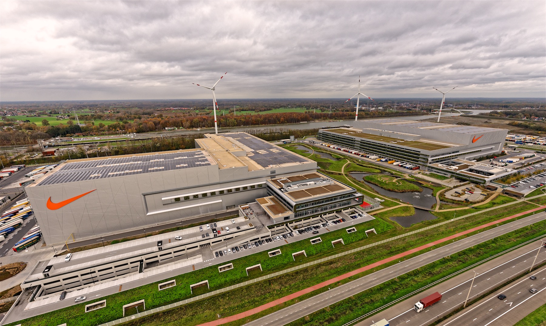De Nike European Logistics Campus, met campussen Wings en Court, bevindt zich in Laakdal/Ham, Antwerpen. Het project omvat zowel industriƫle als kantoor-, retail- en vrijetijdsruimtes. Voor dit project zijn zonnedaken, gebruiksdaken, groendaken en witte daken toegepast.