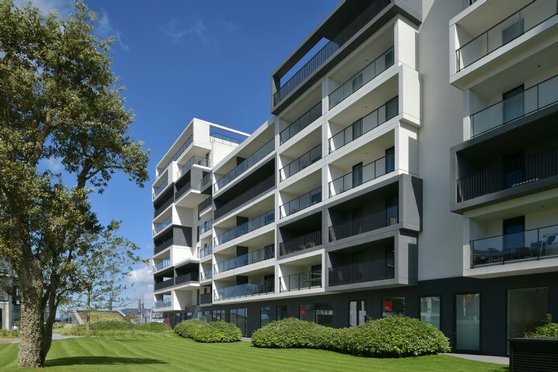 De ‘genius loci’ indachtig, zijn de terrassen opgevat als grote boxen die verwijzen naar de havencontainers. De kaders van de boxen kaderen letterlijk de prachtige uitzichten in en garanderen een optimale bezonning. Net zoals bij het hoekgebouw oogt de façade dynamisch doordat sommige boxen verder zijn ‘uitgetrokken’ dan andere.