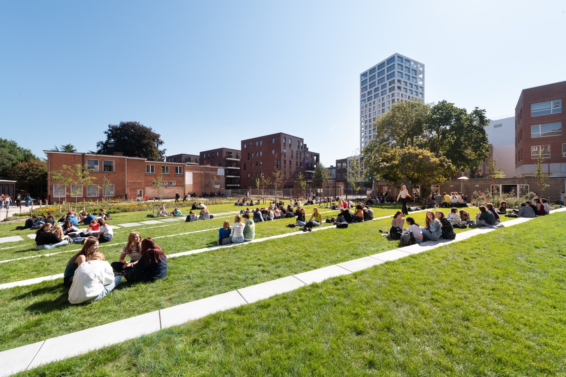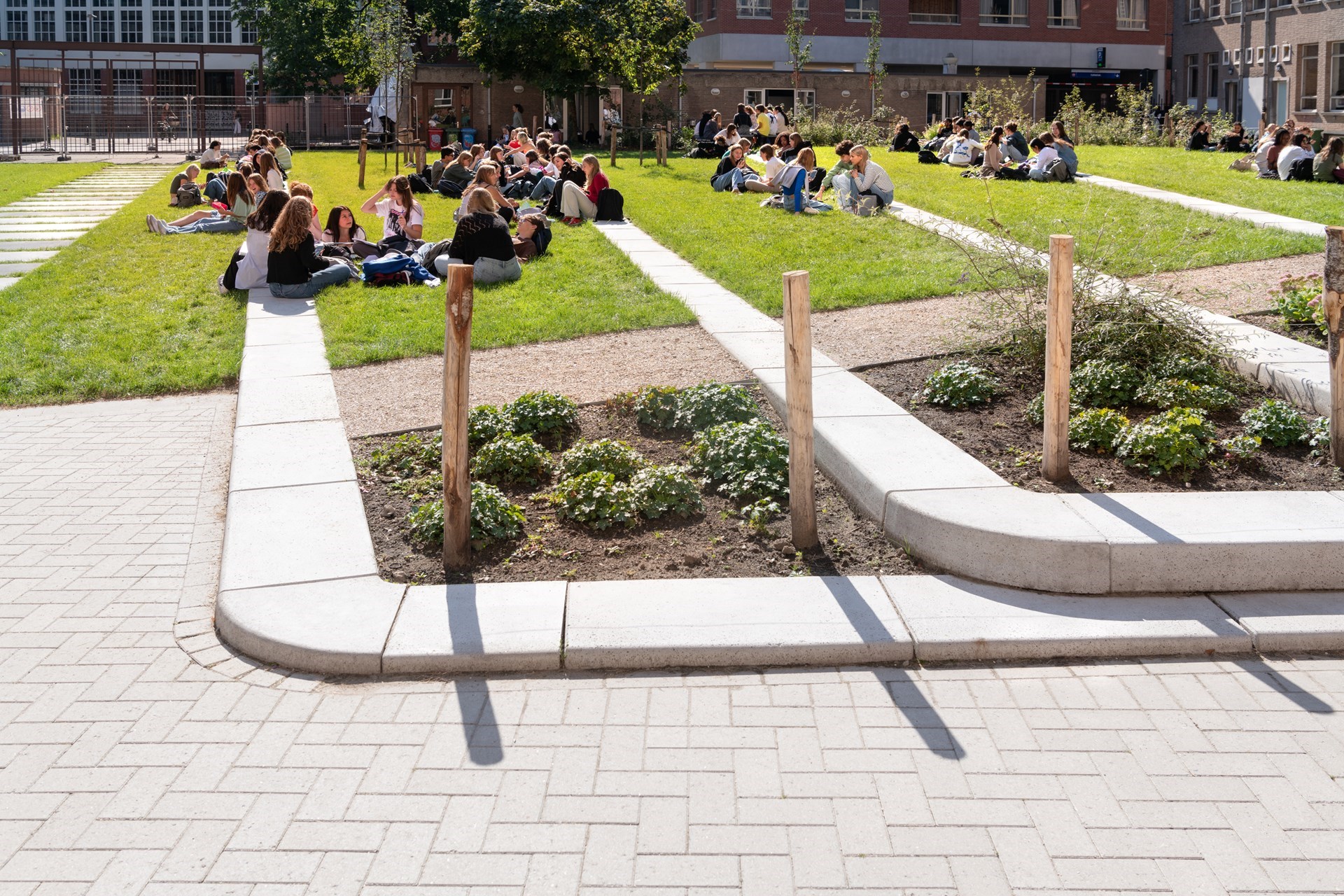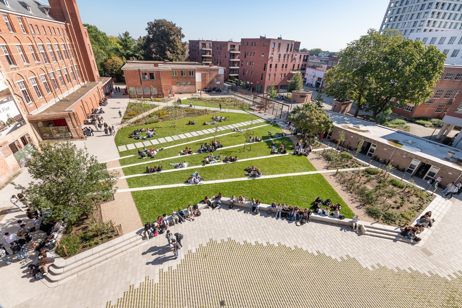 Voor de realisatie van Park Piot - gelegen in de Turnhoutse binnenstad - werden niet-geklasseerde schoolgebouwen van school Heilig Graf afgebroken en enkele speelplaatsen onthard. Zo ontstond er ruimte voor een mooi vergroeningsproject, in synergie met de omgeving en met functionele prefab betonelementen als eyecatcher. Naar een ontwerp van OM/AR architecten bv onderging de vrijgekomen buitenruimte een stevige metamorfose van een grijze zone tot een groen paradijs dat een actieve, rustige en educatieve zone combineert. “De combinatie van groen en beton voelt in dit project bijzonder harmonieus aan”, vertelt Pieter Maes, accountmanager bij Marlux-Stradus nv.