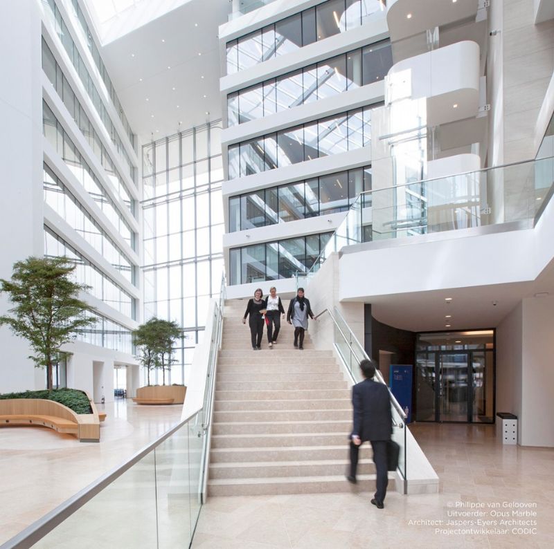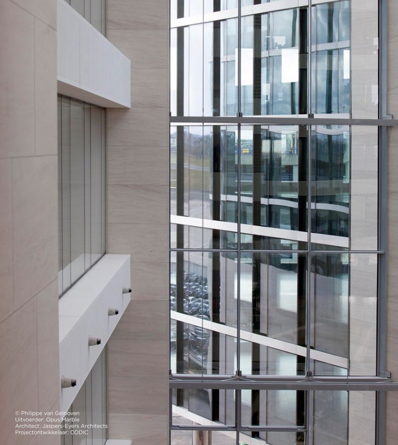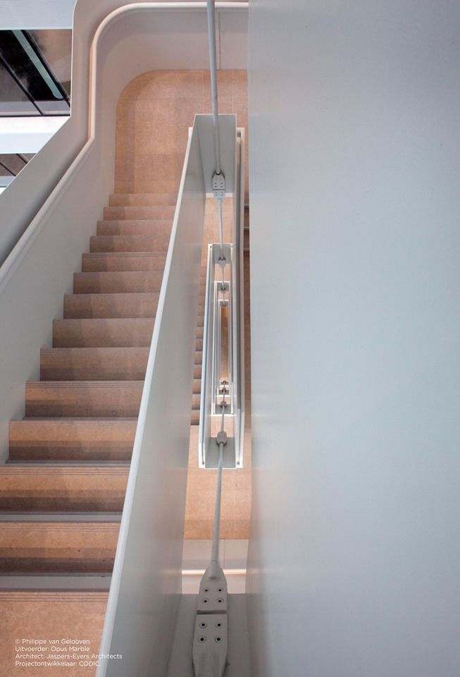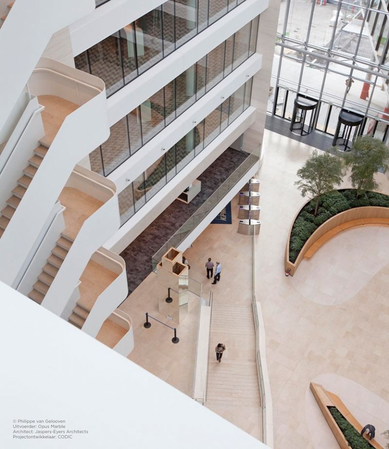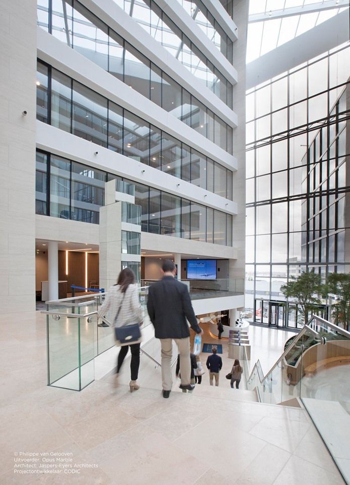 In een voormalige terminal op Brussels Airport is ‘Passport’ verrezen: een state-of-the-art kantoorgebouw waar onder meer KPMG en Microsoft vestigingen in hebben ondergebracht. Jaspers-Eyers zorgde voor het ontwep. In het interieur springt de vloer-en trapbekleding meteen in het oog. Het gebruik van de Egyptische kalksteen Sinai Pearl van Beltrami Natural Stone heeft daarin een belangrijke rol gespeeld.