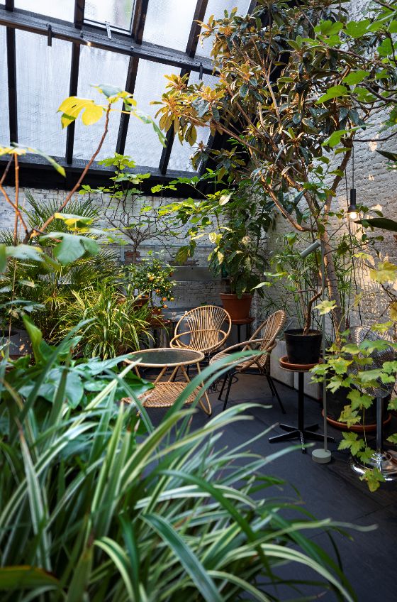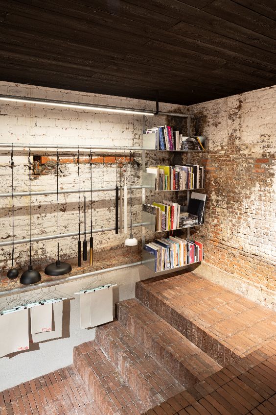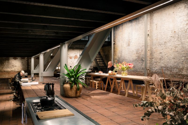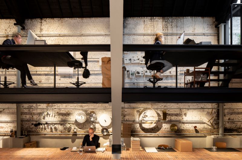 De werkplaats is een mix van nieuwe en bestaande constructies en niveaus en vormt een creatief platform voor zowel werknemers als klanten. Aardse kleuren en basismaterialen baden in een subtiel gedimd licht. De plantenkamer brengt natuur en daglicht in het gebouw.