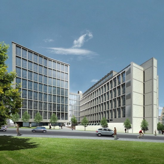 Herbestemming Telex-gebouw van Léon Stynen door Crepain Binst Architecture tot duurzaam en flexibel kantoorgebouw.