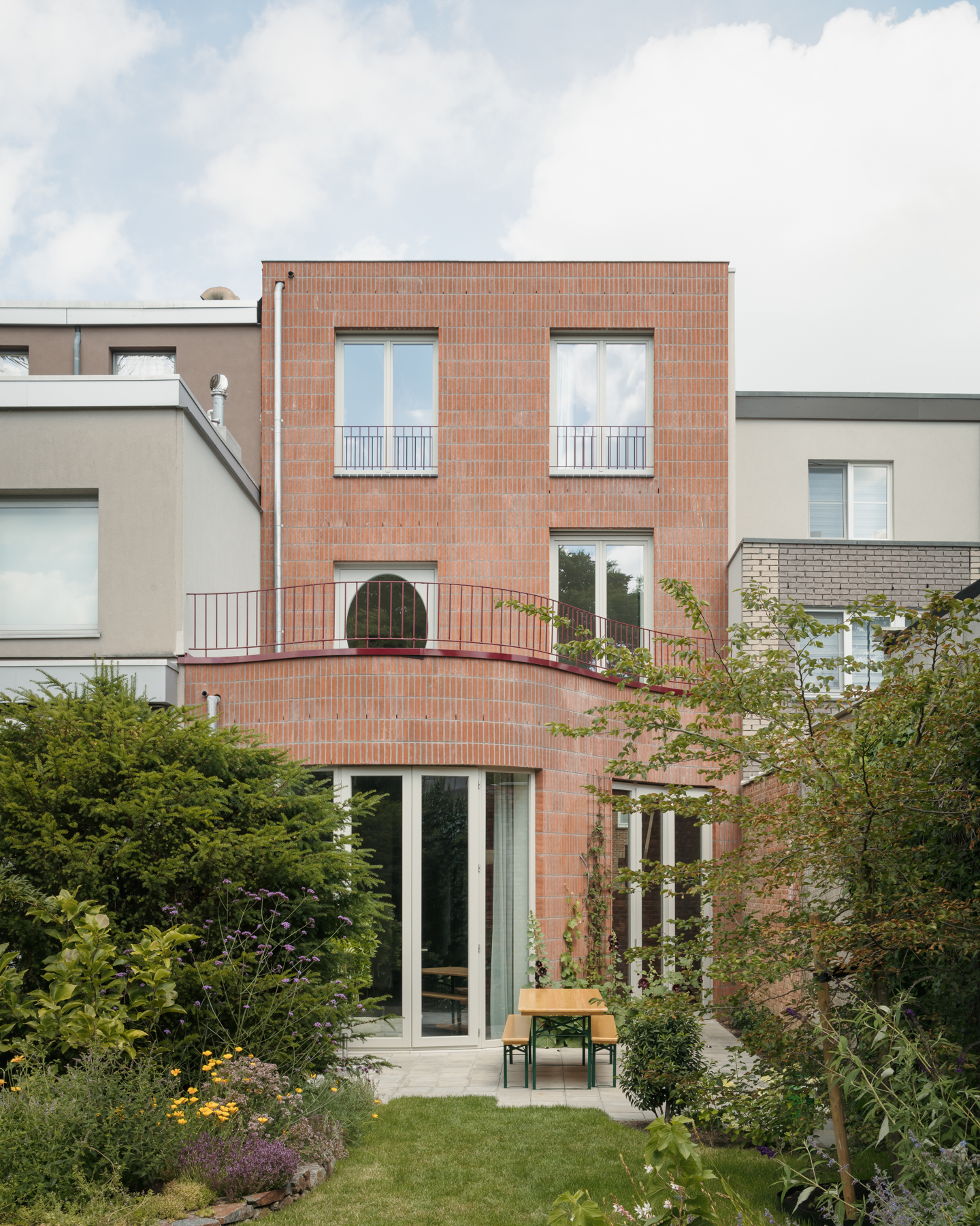Poot Architectuur kent duidelijk zijn weg in smalle rijhuizen. Het architectenbureau realiseerde al verschillende projecten in Antwerpen. Het project ‘Sint Benedictus’ omvatte een braakliggend terrein in Mortsel, midden in een rustige straat met vooral monotone woningen uit de jaren ’50 en ’60. Poot Architectuur vulde het leeg perceel met een eenvoudig bakstenen gebouw met een gebogen gevel.