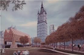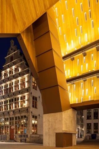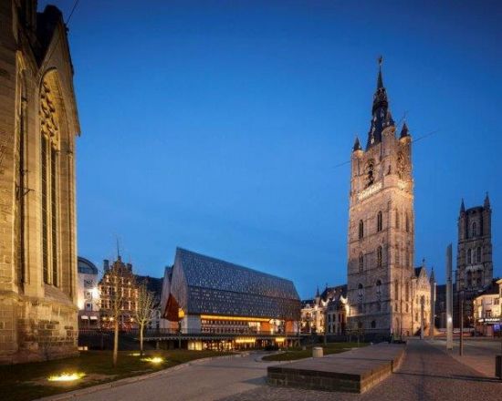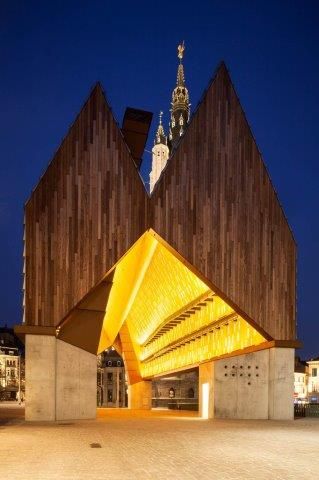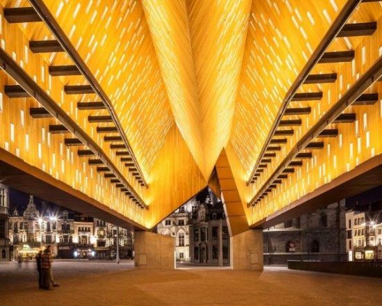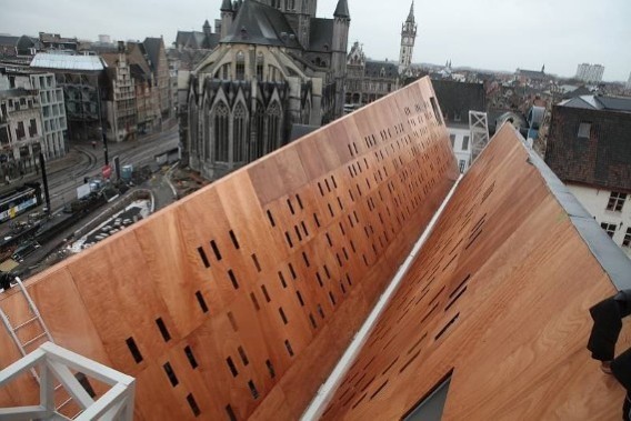 De nieuwe stadshal in Gent is een ontwerp van Robbrecht en Daem en Marie-José Van Hee. Het is een staalstructuur met een houten bekleding die rust op vier sokkels. In de houten dakbekleding zijn 1600 kleine raampjes geïntegreerd. Onder de stadshal bevinden zich bovendien ook een fietsenstalling en een grand café, een sanitaire blok, een artiestenruimte en een grand café dat via een groot terras aansluit op een 'green' naast de stadshal.