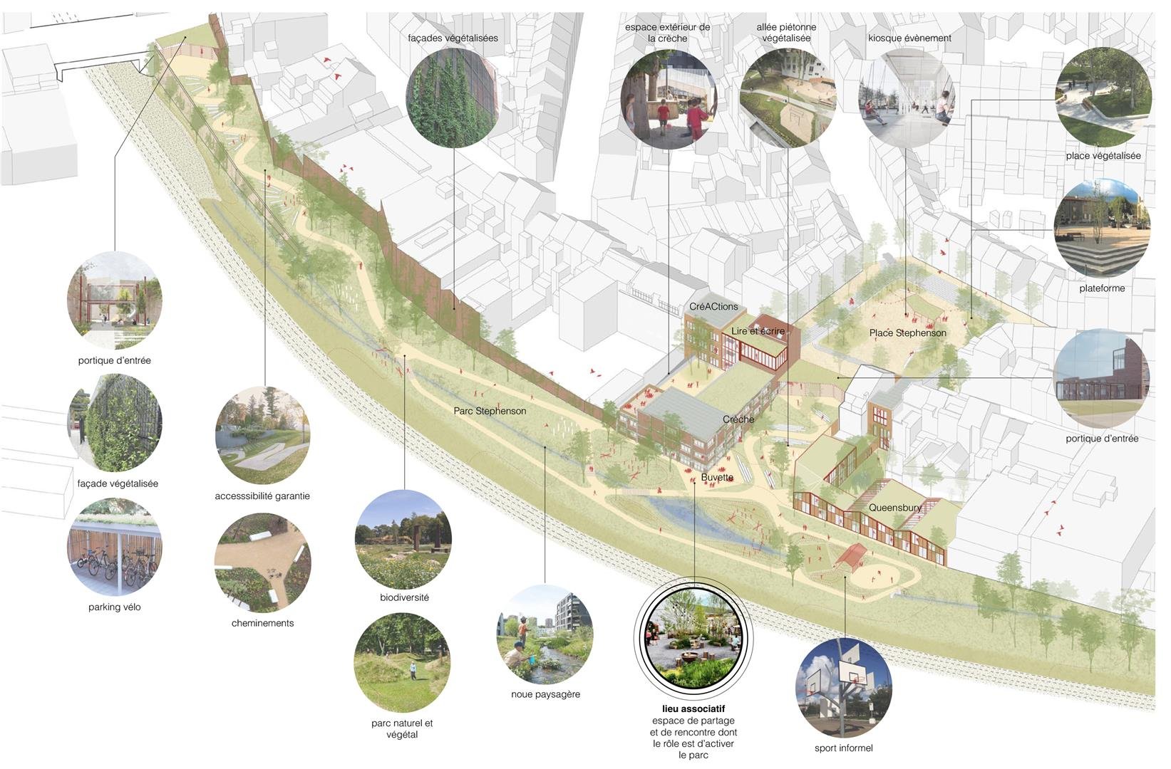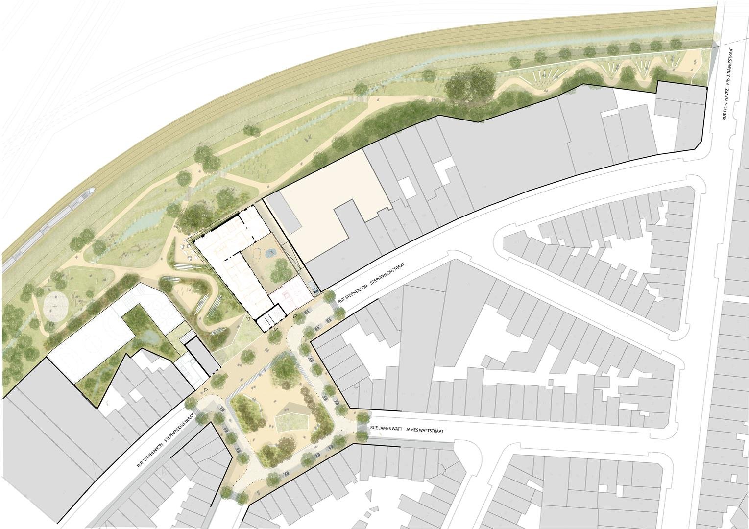 Het project beoogt de aanleg van een openbaar park en een voorzieningenknooppunt in Schaarbeek, in het kader van een wijkcontract. De buitenruimtes bestaande uit de voormalige moestuinen langs de spoorweg worden opnieuw zichtbaar verbonden met de openbare ruimte en zullen de herinrichting van het Stephensonplein omvatten. Deze transformatie wordt gecombineerd met de aanleg van sportvoorzieningen, een kinderdagverblijf, een overdekte openbare gemeenschappelijke ruimte, lokalen voor de parkwachters en lokalen voor sociale organisaties. De inplanting van deze functies en de inrichting van het park zijn coherent ontworpen om gevels te activeren en sociale controle te bevorderen.
