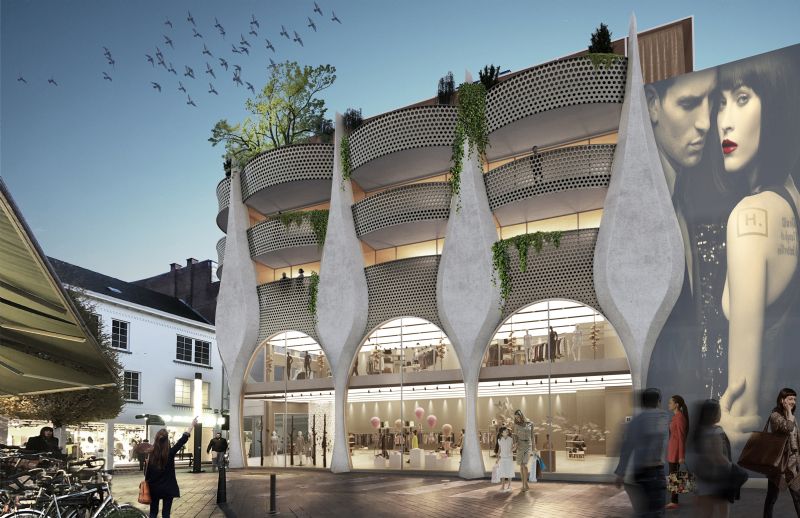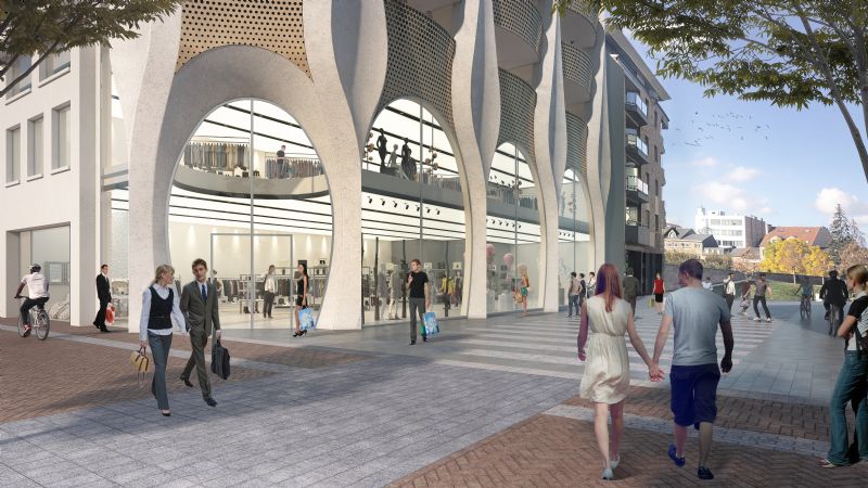 Het Molenpoortplein in Hasselt krijgt een nieuw architecturaal baken. Twee gebouwen aan de Demerstraat ruimen plaats voor een handelspand en luxe-appartementen op de bovenverdiepingen. In het oog springen de organisch gevormde kolommen die een interessante wisselwerking aangaan met de gebogen terrassen.