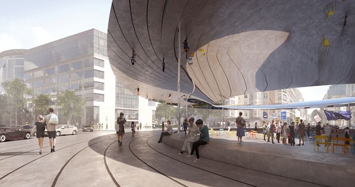 Door z’n centrale ligging in de Europese Wijk omringd door de belangrijkste Europese instellingen, vormt deze plek een belangrijke toegang tot de EU. Het ontwerp transformeert een ruimte die vandaag volledig gedomineerd wordt door gemotoriseerd verkeer in een voetgangersgebied en ontmoetingsplek. Geïnspireerd door de zaal van het Europese parlement, voorzien we centraal op het plein een komvormige agora overdekt door een reflecterend dak, dat symbolisch alle burgers en instellingen verenigt. Het project helpt om van Brussel een stad voor mensen in plaats van een stad voor auto’s te maken.
