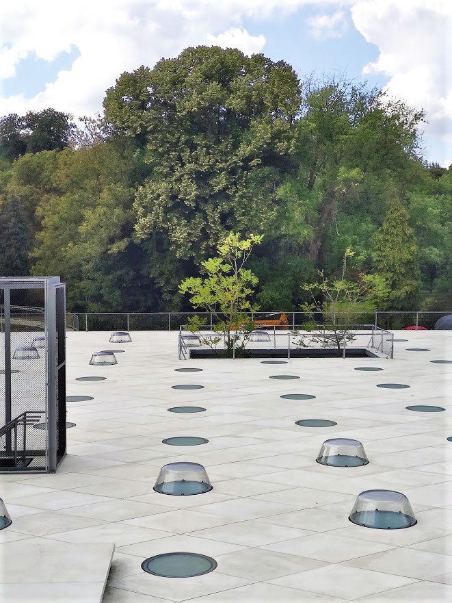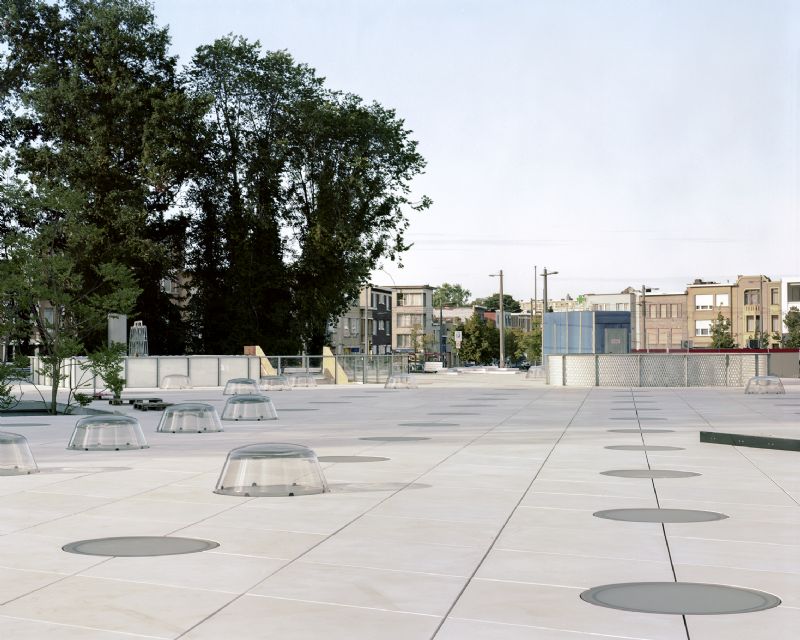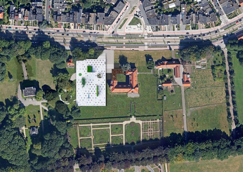 Het oorspronkelijke schoolgebouw van architect Pol Berger bleef behouden en werd hersteld als paviljoen in het park. De latere bijbouwen uit de jaren ‘50 maakten plaats voor een laag, vlak volume waarvan het dakterras buiten de schooluren ook publiek toegankelijk is. Het ontwerp herstelt zo de continuïteit van het park en het breidt het Rivierenhof verder uit tot aan de straatkant. Twee zichtrelaties spelen voor het ontwerp een belangrijke rol: enerzijds deze tussen Deurne en het park en anderzijds de relatie van het historisch schoolgebouw met de rozentuin.