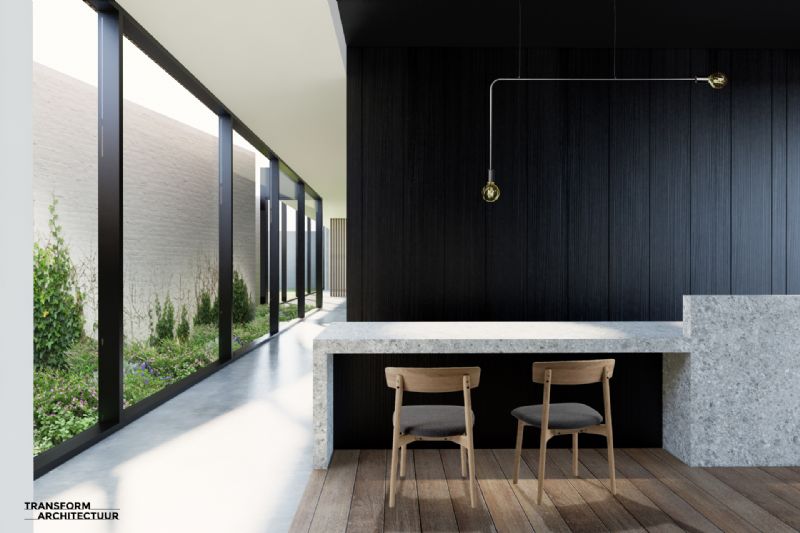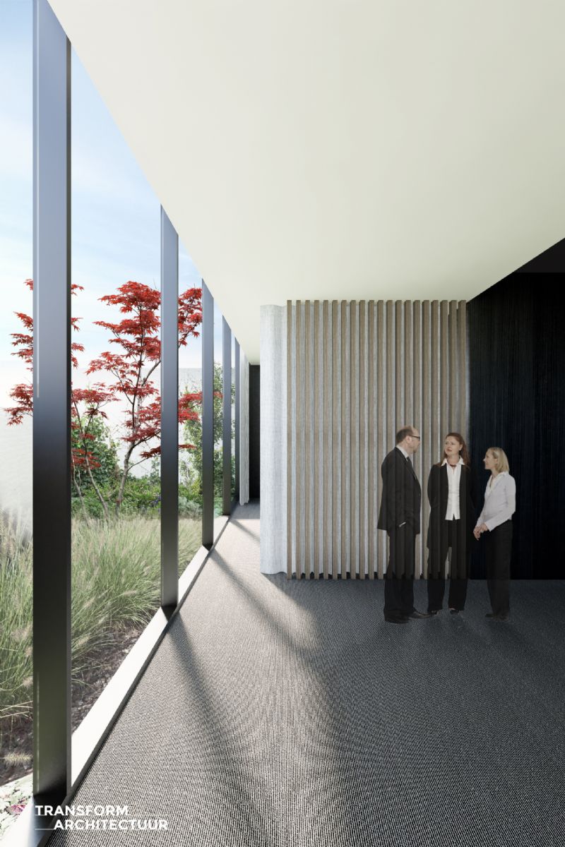 Het volledige gelijklvoers wordt ingericht als uitvaartcentrum met twee rouwkamers en een ontmoetingsruimte. Op de verdieping worden twee ruime doorzon-appartementen voorzien met terrassen aan de voor- en achtergevel.
