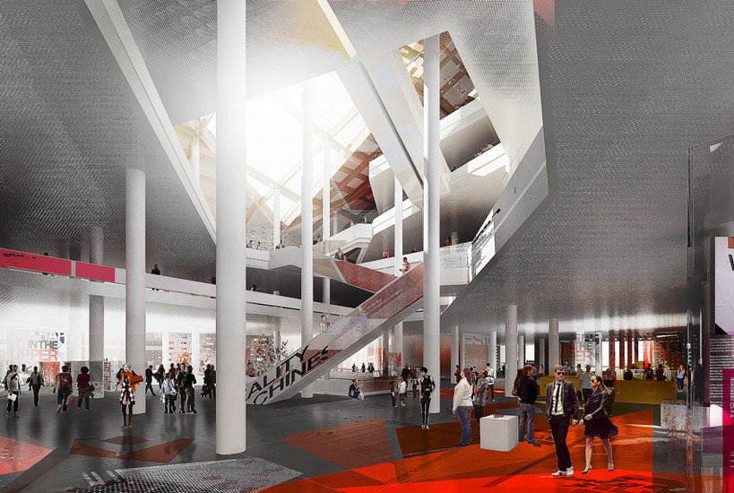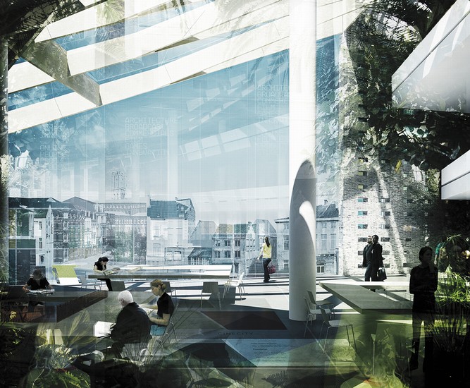 Het gebouw is opgebouwd rond een interne centrale Agora, van waaruit alle functies in het gebouw worden ontsloten. Het gebouw opent zich met grote openingen naar de stad op de meest interessante zichtassen. Het volume van het gebouw werd gesculpteerd in haar omgeving om de zichtassen rond het gebouw te vrijwaren, en boeiende stedelijke buitenruimte te creëren op deze belangrijke 360° locatie.