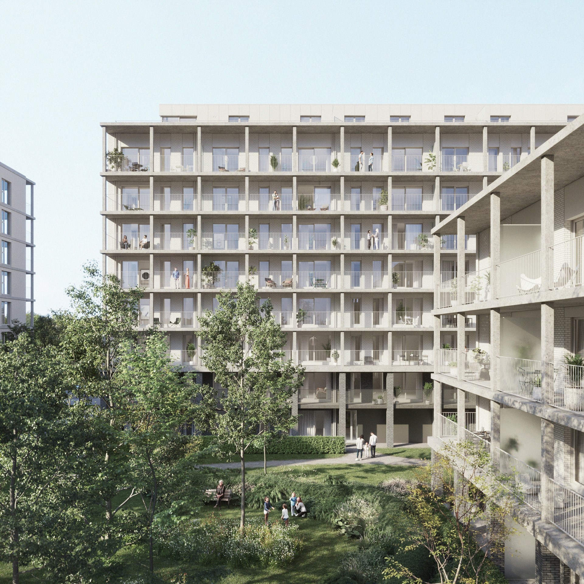 Het wonen in een groene omgeving wordt vertaald in de massieve plint van de gebouwen. Deze is opgebouwd uit metselwerk pijlers in groene, aardse tinten. De terrassen van de woningen zijn omsloten en intiem. De weelderige begroeiing in de tuin neemt de hoogte aan van de gebouwplint. Bijzondere aandacht gaat naar de rijkelijke inkomhallen: ze maken steeds de verbinding tussen straat- en tuingevel en garanderen zo een vlotte toegang tot de tuin die de bewoners delen.
