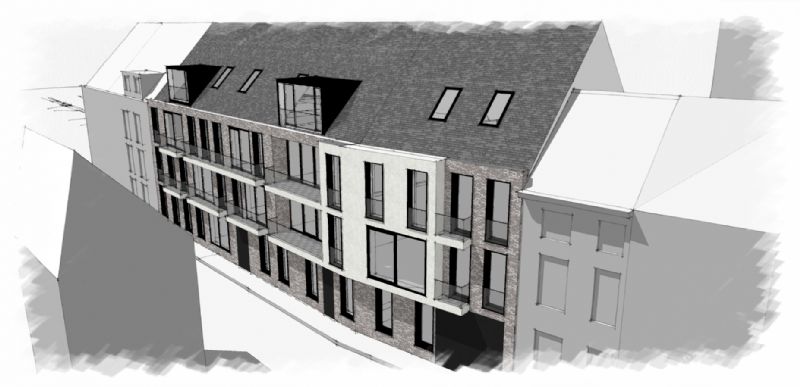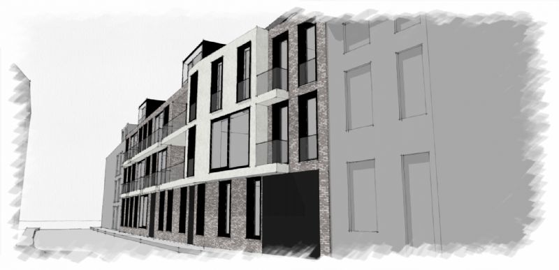 Een bestaand magazijn in hartje Gent deel uitmakend van een groter perceel gelegen aan de Krommewal. Ontwikkelaar Urbanlink kiest meergezinswoningen als herbestemming.