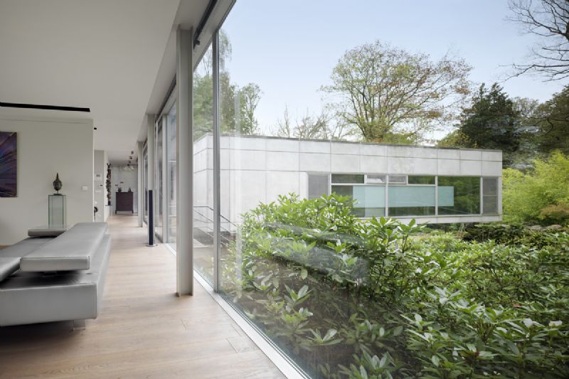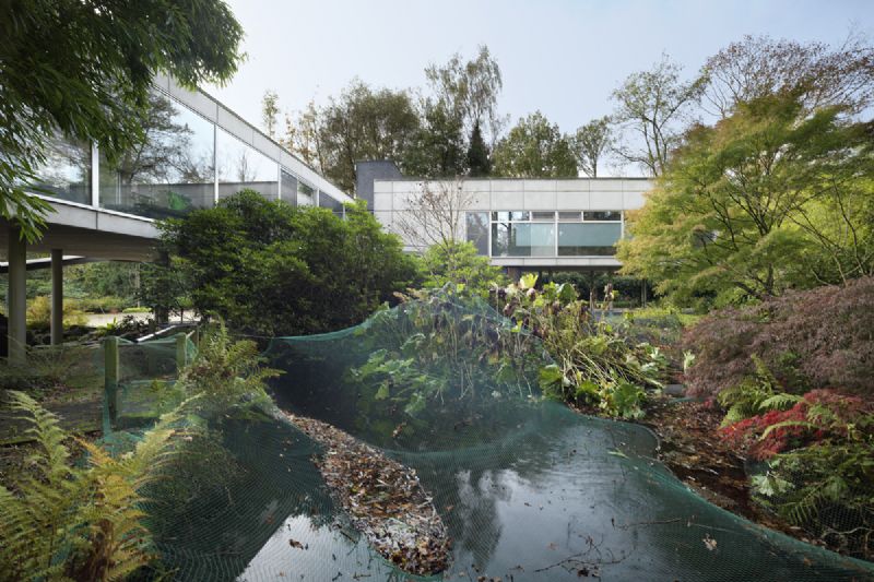 Door de woning op palen te zetten werd de bebouwde grondoppervlakte tot een minimum herleid en bleven de vijvers en Japanse tuin gevrijwaard. De natuur loopt onder, tussen en boven de leefruimten verder.