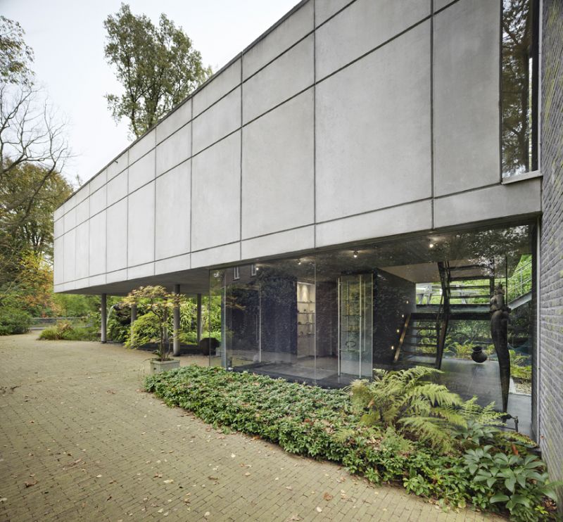 De woning bestaat uit twee liggende, balkvormige volumes in lichtgrijze beton die door tengere palen boven de tuin en het water worden getild.