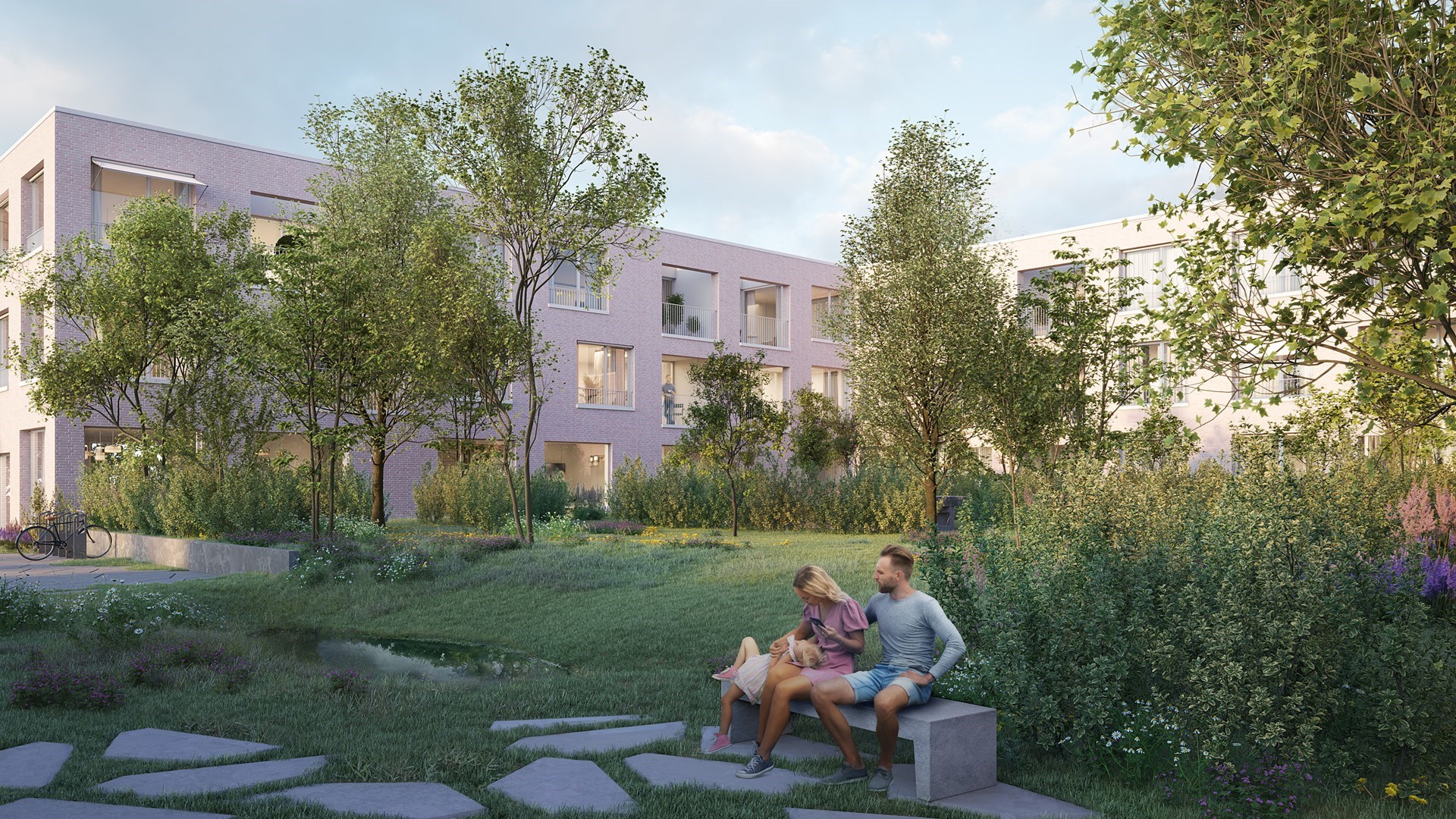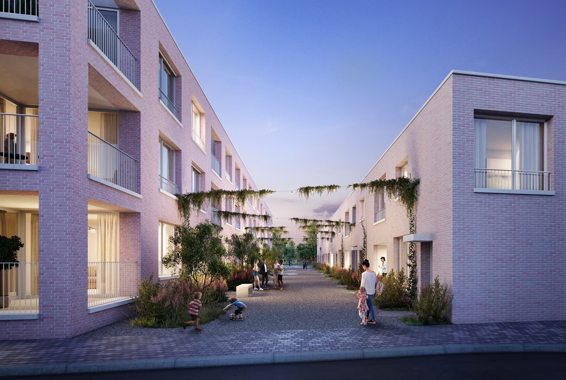 Het kleinschalig woonproject voorziet in 42 appartementen gesitueerd rond een groen binnengebied, 6 grondgebonden woningen, een buurtcentrum, en een gebouw met 12 studio’s gericht op begeleid zelfstandig wonen. Het orthogonale karakter van de omgeving inspireert en creëert een strokenpatroon op het terrein. Dit wordt ingezet om duidelijk te onderscheiden buitenruimtes te creëren, elk met hun eigen statuut.