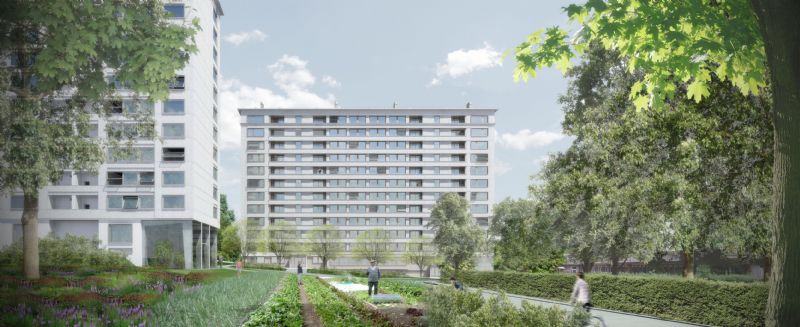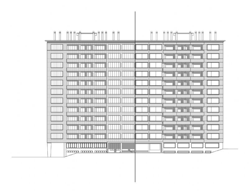 Het concept neemt als startpunt het herinterpreteren van de bestaande architectuur. Voor deze reden zal de façade opnieuw geïsoleerd en ingepakt worden met nieuwe prefab betonelementen in combinatie met nieuwe ramen met ruime glasvlakken en sterk gearticuleerde raamkaders om zo tot een nieuwe architecturale lezing van de gebouwen te komen. Variërende massa, kleur en belijning van het beton zoeken een herinterpretatie van het decoratief patroon van de originele façade.Om terug tot een elegante gevel te komen is - paradoxaal - de gevel gesimplificeerd en robuuster.