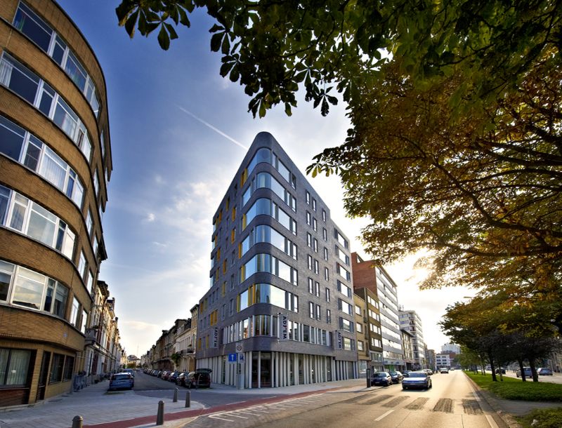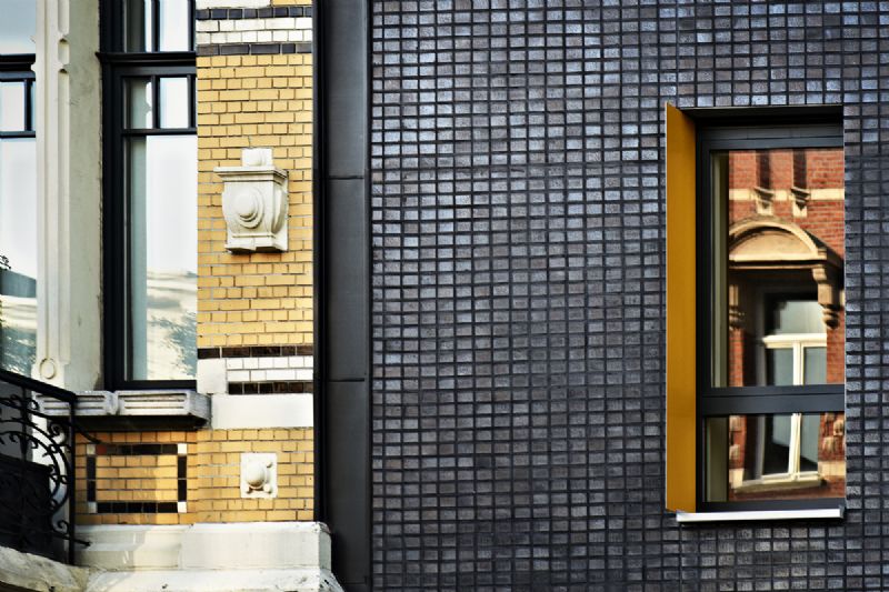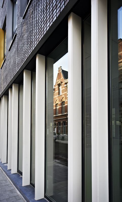 Een hoekgebouw heeft vaak een extra dimensie. Het vormt niet enkel de overgang tussen twee straten, maar ook tussen twee schalen, twee buurten, twee karakters. Het kan een scharnierfunctie vervullen, het kan dienst doen als poort voor een stadsgedeelte of wijk. Dit project probeert door zijn verspringende kroonlijst, materialen en kleuren, op een elegante wijze een link te vormen tussen de hoogbouw van de drukke Plantin en Moretuslei, en de lagere art-deco stijl van de Dolfijnstraat. Het brengt een verschillend verhaal, afhankelijk van de zijde langswaar je het benadert. Het gebouw straalt massiviteit uit, en krijgt met zijn glanzende gevelsteen en gebogen glas een grote dynamiek. Deze gebogen vorm refereert tevens naar de overstaande hoekgebouwen.