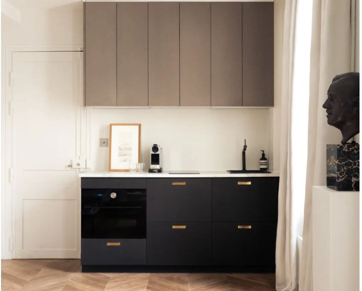 Malgré sa petite superficie, l'appartement ne se présente pas comme un studio ordinaire. L'espace est intelligemment cloisonné, avec une zone de vie distincte de l’espace nuit, créant ainsi une sensation d'intimité et de confort. La cuisine, discrètement intégrée au salon, adopte des façades brutes noires et grises sur des caissons IKEA, un parfait exemple d'IKEA Hack rehaussé par des détails en laiton et un plan de travail en grès cérame imitation marbre.