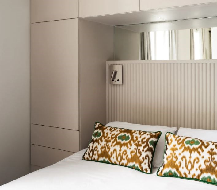 Des étagères et niches soigneusement placées permettent d'exposer de beaux objets tout en maximisant la lumière naturelle, notamment grâce à des fonds en miroir qui réfléchissent subtilement la lumière sans la dominer. Dans la chambre, une œuvre de Thomas Devaux crée un point focal, tandis que les portes de salle de bains en galandage et les éclats réfléchissants multiplient les effets visuels, ajoutant une dimension dynamique à l’espace.