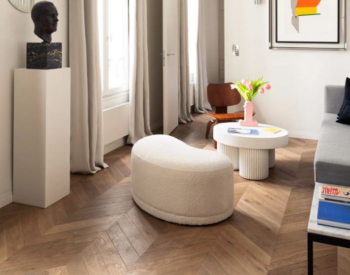L'approche de l'architecte a été de créer un environnement neutre et raffiné, où la palette de couleurs claire permet aux œuvres d'art et au mobilier de se démarquer. Le choix des matériaux, tel que le parquet en chêne posé en point de Hongrie (Chêne de l’est) et les murs peints en "Strong White" avec un plafond "All White" de Farrow & Ball, reflète une esthétique parisienne classique tout en étant actuelle.