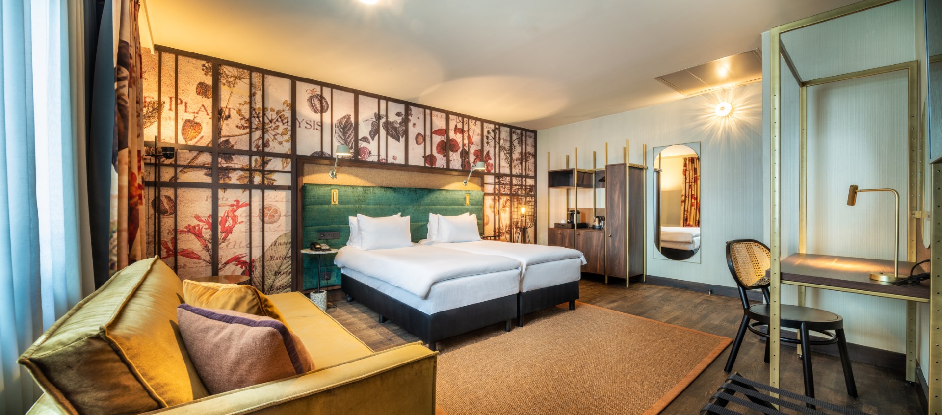 Alina Rusenko, une des architectes d’intérieur de l’agence, a imaginé trois styles différents pour les 284 chambres des huit étages de l’hôtel : tropical (3 étages), végétal (3 étages) et floral (2 étages). Immersion subtile et totale, chaque étage plonge le visiteur dans une ambiance singulière, des grands couloirs avec salons thématiques jusqu’aux chambres, le tout dans une décoration moderne chaude et audacieuse.