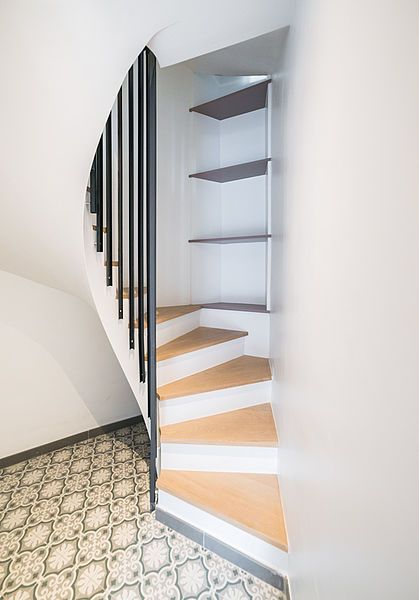 « Ainsi, seules les pièces de vie et de nuit sont présentes sur l'unique façade. L'épaisseur constituée par les locaux techniques et d'usages s'insère en second plan, permettant ainsi de libérer l'espace nécessaire au sein de l'angle aigu de la parcelle pour la colonne vertébrale que constitue l'escalier à noyau ouvert, surplombé par une fenêtre de toit distillant une douce lumière naturelle au travers des niveaux de l'habitation. »