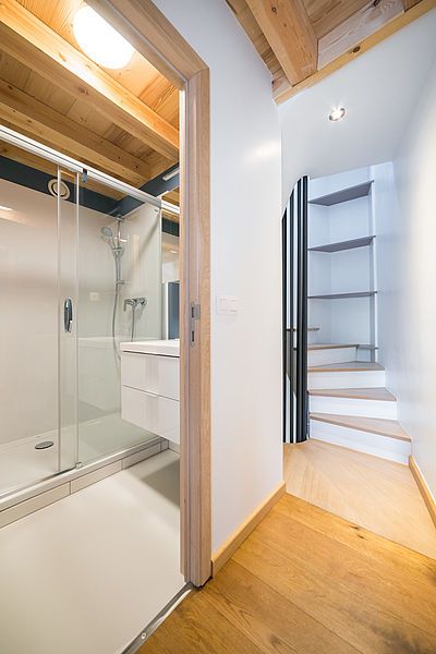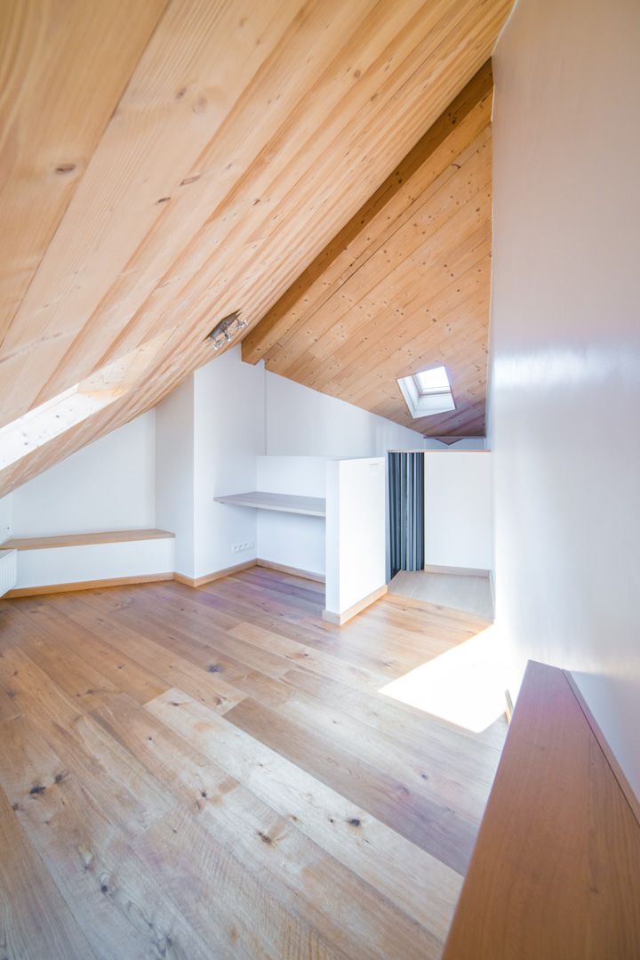« L’expression volumétrique de cette transformation, par les jeux de plein-vide et d’alignement-retrait, confère un caractère contemporain à l’habitation », continuent les architectes. Le projet est une construction en ossature bois afin de maximiser les présences d’isolation au sein de parois de faible épaisseur. A l’intérieur, un mur porteur en bois contre-cloué (10 cm d’épaisseur) traverse les étages de la construction. Quant aux parois, elles ont été conçues les plus écologiques possible : bardage en bois thermo traité, panneaux de fibre de bois contreventant, flocage de cellulose, plaques de gypse...