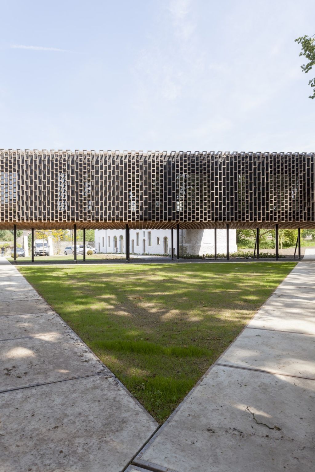 L'extension a la forme d'un volume flottant. A peine perceptible en entrant sur le site, l'ensemble revêtu de bois porté par de fines colonnes d'acier, jouxte un étang. La perméabilité du paysage entre l'ancienne entrée officielle et le parc est maximisée par ce volume aérien qui laisse passer les promeneurs.