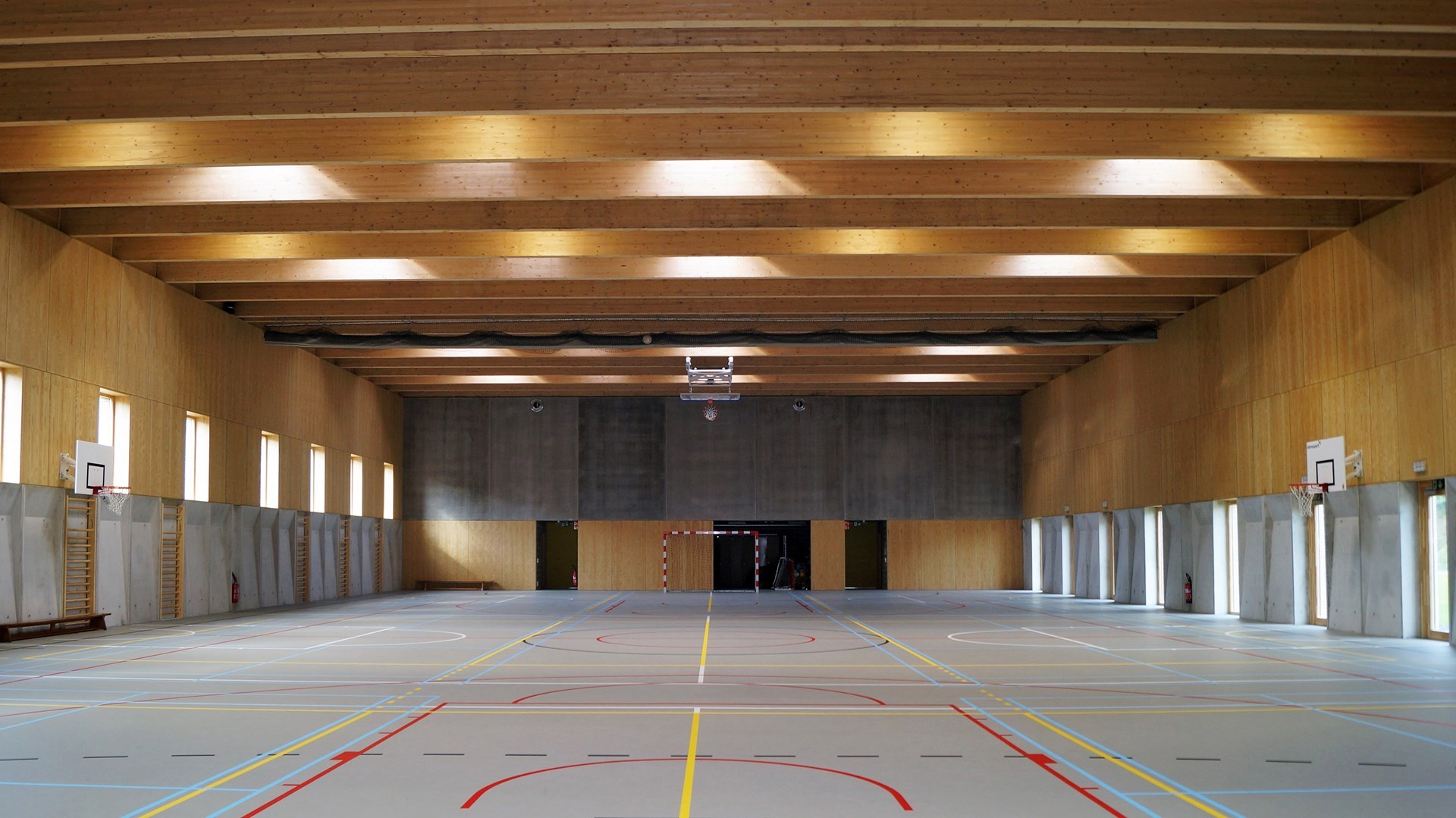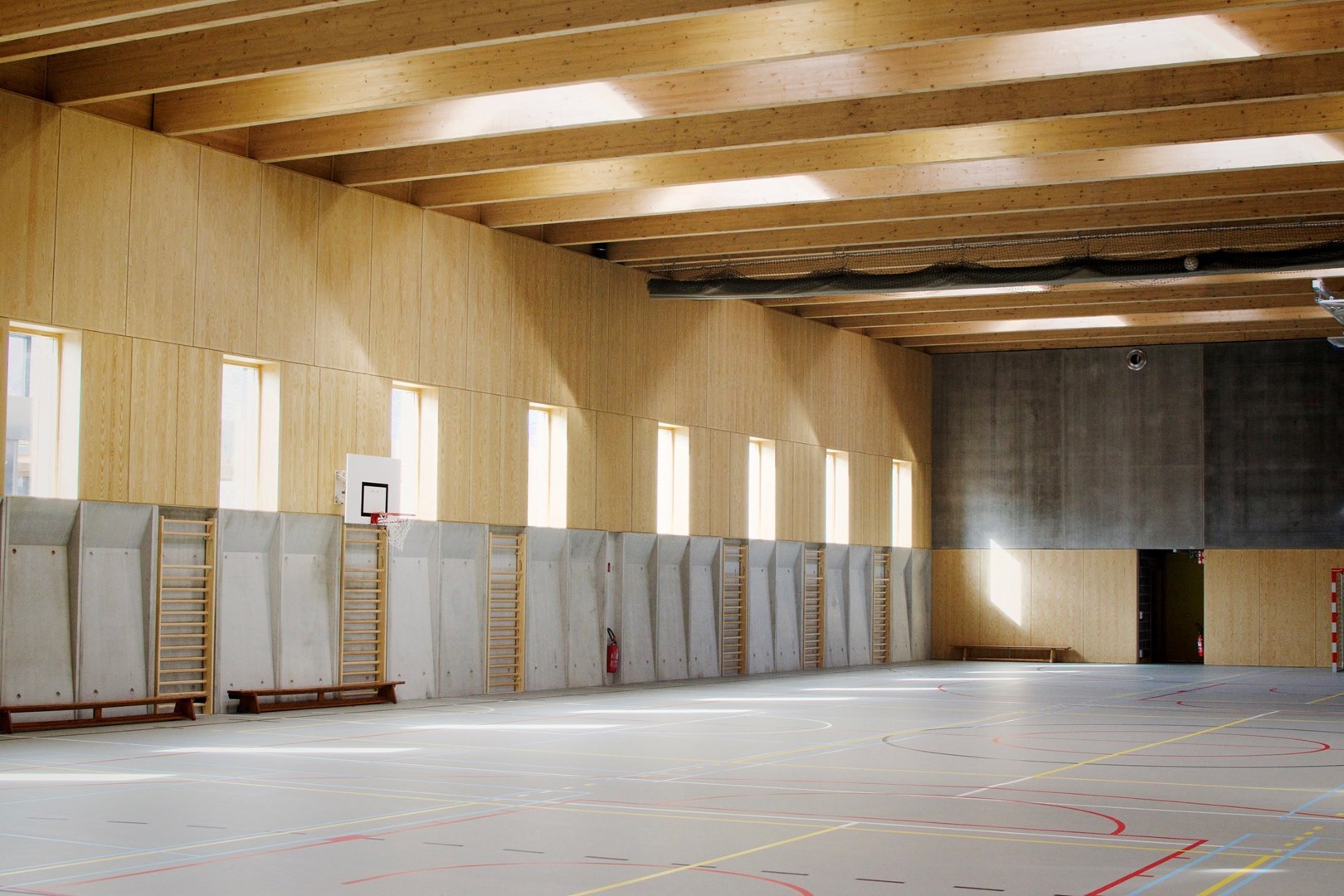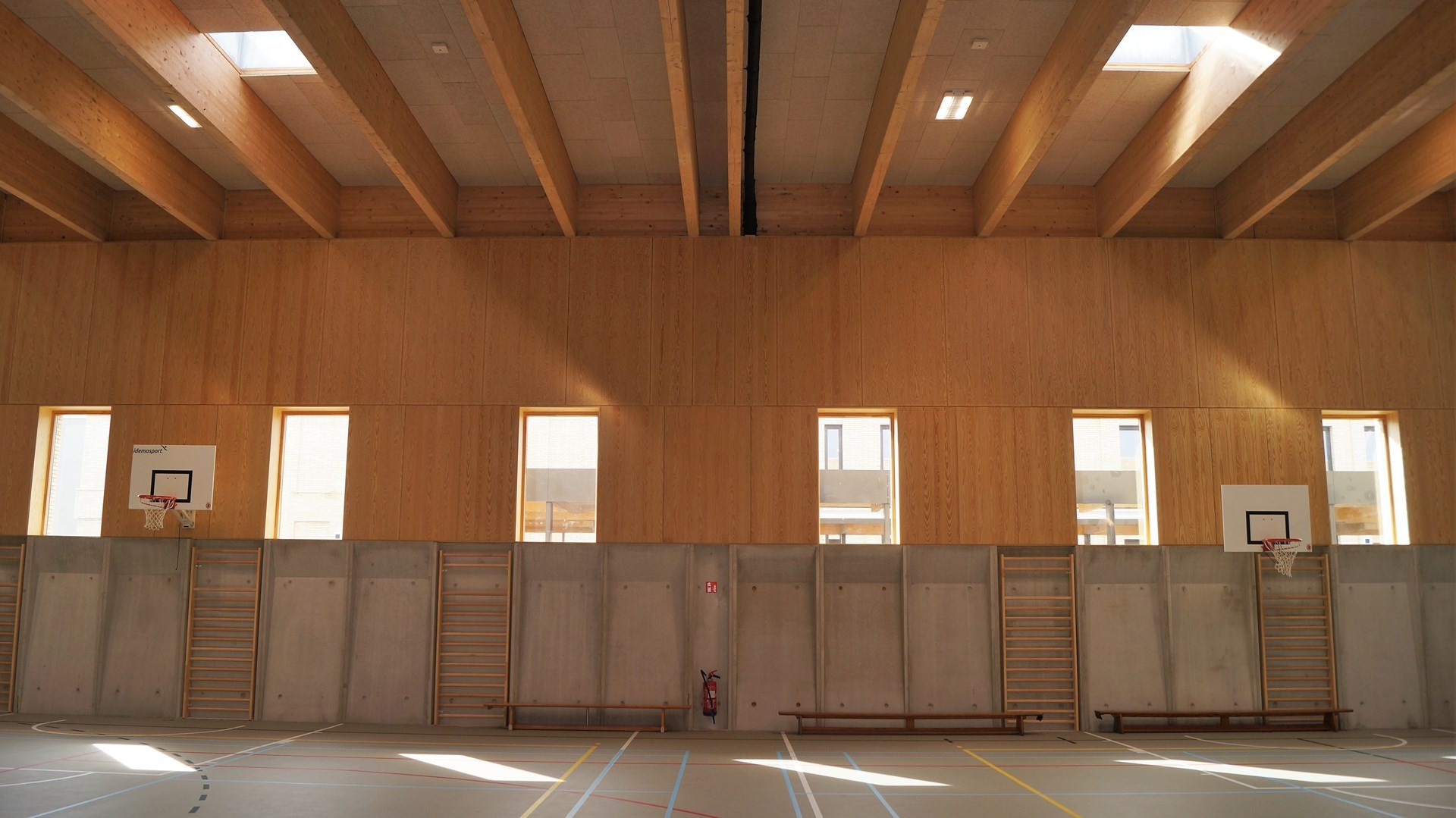 Les nombreux éléments en bois attirent l'attention. « Pour la Fédération Wallonie-Bruxelles, le choix du bois massif de type CLT (cross laminated timber) était avant tout une solution technique afin de répondre à nos exigences claires : rapidité d'exécution par la préfabrication, aspect chaleureux et matériau naturel à forte capacité de stockage de CO2 », explique Jérôme Meunier, coordinateur du département Architecture de la Fédération Wallonie-Bruxelles.