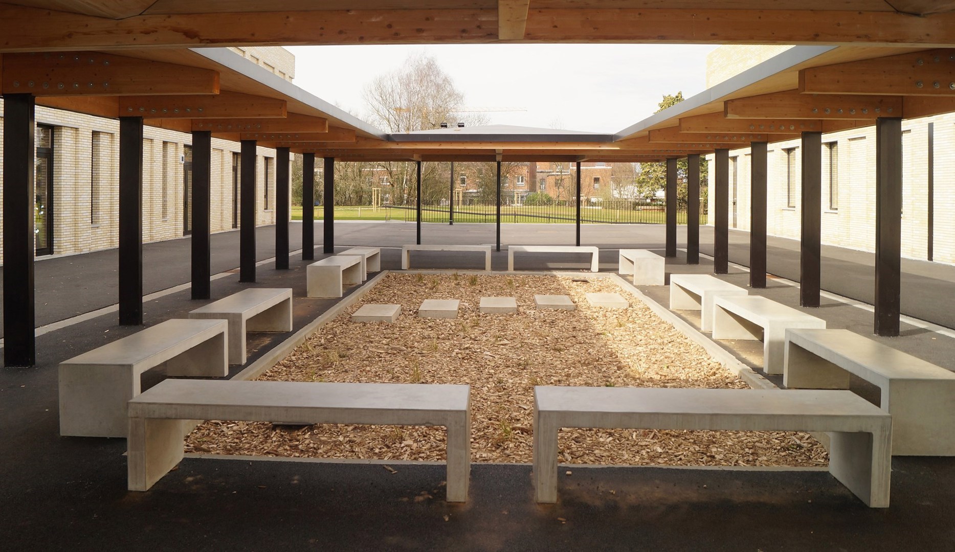 Le projet sur le site de Gosselies se compose de trois structures : un bâtiment de salles de classe (R+1) principalement en CLT, une salle de sport en ossature bois et la structure du toit en CLT/lamellé croisé, et un préau constitué d’éléments en CLT provenant du premier bâtiment. « Ce dernier est tout à fait unique et s'inscrit parfaitement dans une vision circulaire. Nous avons réutilisé les chutes des découpes de fenêtres et de portes dans les panneaux pour le préau, de sorte qu'il n'y a pas de gaspillage de bois », explique Martin Guillaume.