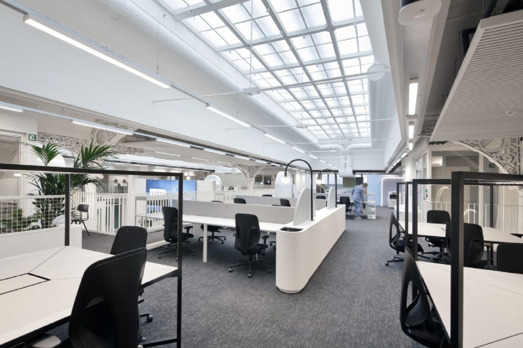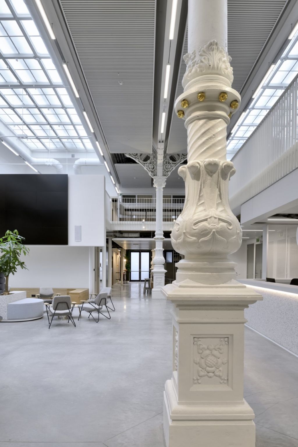 « Constructivement, le projet a intégré la contrainte d’une enveloppe classée ne permettant pas d’accès par les toitures ou de vastes baies de façade : les bétons sont coulés en place, le nouveau plancher de la salle des guichets est une structure mixte acier, pour les poutres et colonnes et bois pour les hourdis de grande portée, » ajoutent les architectes. « Le projet offre en outre une grande flexibilité d’usage pour ses occupants ou des acteurs extérieurs souhaitant y organiser évènements, projections, réceptions dans le foyer ou sur le rooftop desservi par un espace convivial. »