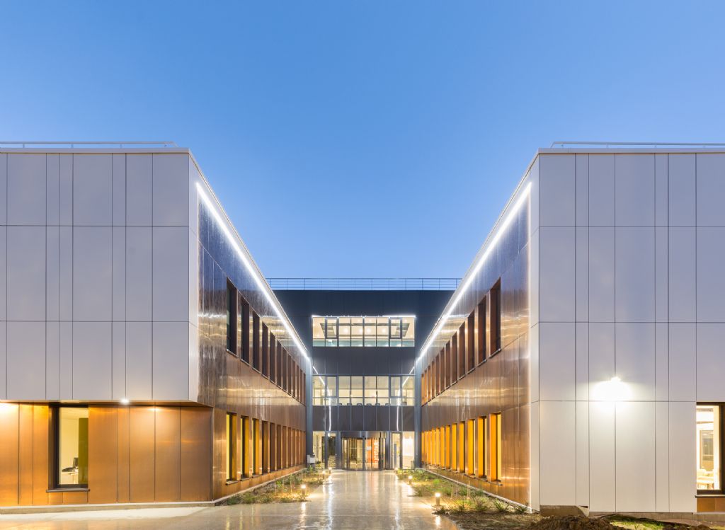 L’orientation de l’immeuble de bureaux a été travaillée en « peigne », avec l’aide des spécialistes de l’équipe Matriciel et le conseil avisé de Loginfra-STRATEGY, de manière à exploiter au mieux les ressources naturelles du site et à faire de ce projet un bâtiment exemplaire en matière de consommation d’énergie. Sans être « passif », il est en effet largement autonome d’un point de vue énergétique grâce, notamment, à des panneaux solaires photovoltaïques, des stores solaires extérieurs, un vitrage étudié façade par façade, des dispositifs d’éclairage dimmables et LED, une isolation renforcée, et la récupération de l’énergie des accélérateurs en test via une pompe à chaleur alimentant le système de climatisation des lieux.