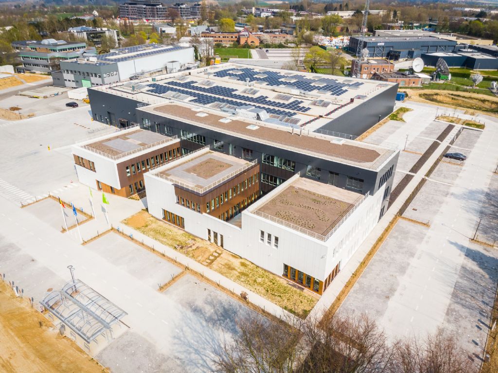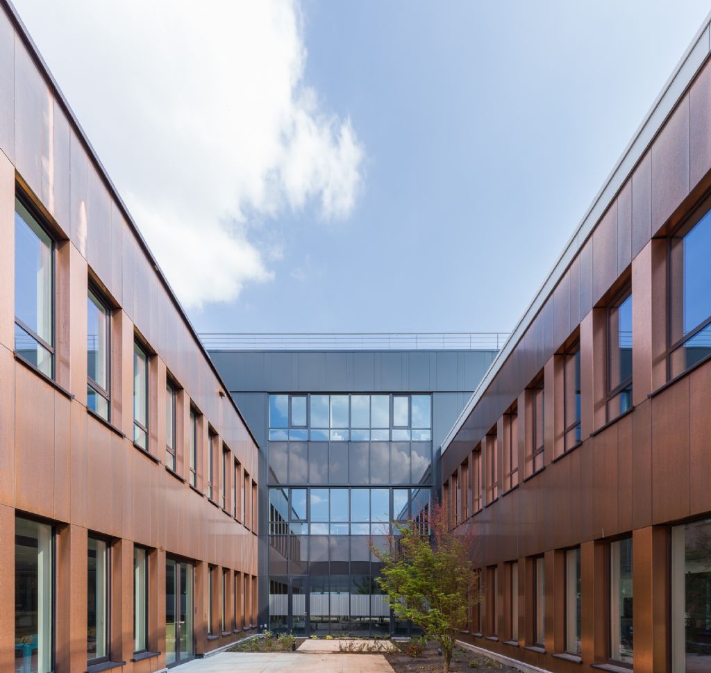 L’aspect paysager n’a pas été négligé non plus, même si l’ensemble est implanté dans un parc scientifique. Toutes les toitures des bureaux sont végétalisées pour permettre le développement d’un biotope local en combinaison avec l’occupation du personnel en période de beau temps. Des essences locales de plantations ont été privilégiées et mises en place autour du projet, et « tissées » avec celles, préexistantes, du site et du campus. Un bassin d’orage naturel et une mare agrémentent les abords tout en participant au développement du biotope (semi-)aquatique local