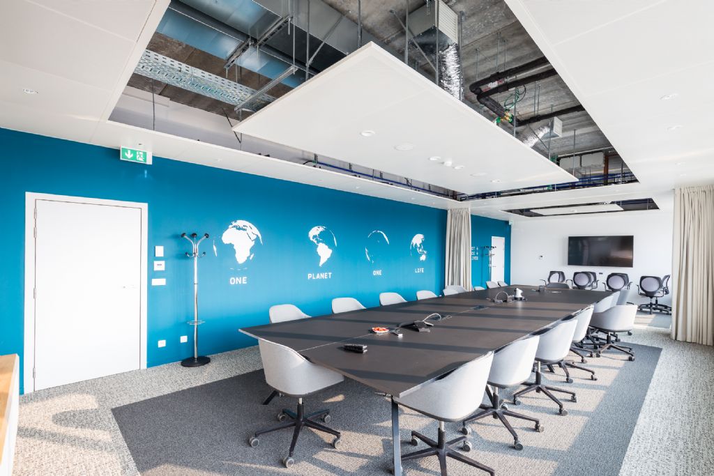 Les façades du hall, véritable « black box » sobre et discrète, contrastent avec celles des bureaux, dont l’habillage métallique blanc inspire la clarté et la sobriété. Les architectes ont cependant traité quelques zones en cuivre naturel (notamment l’entrée principale et le patio abritant la terrasse de la cafétéria), un des composants principaux utilisés dans la construction des cyclotrons. Ce rappel, subtil, souligne utilement et sobrement l’esthétique de l’immeuble et marque le visiteur bien avant son entrée dans les lieux… A l’intérieur, l’acoustique et la lumière naturelle ont été étudiées avec grand soin. Les bureaux ouverts, les espaces de concentration, les salles de réunions et les espaces collectifs se succèdent sans jamais compromettre la tranquillité des services hébergés et le confort de travail. Les ambiances sont volontairement différentes et variées, privilégiant toujours la sobriété et la qualité des espaces offerts, qui ont été conçus pour permettre à chaque instant et à chacun(e) de travailler, d’échanger, de se concentrer et même de se restaurer et de se divertir sans compromettre l’efficacité du travail. Une attention particulière a été apportée au choix des matériaux et des couleurs, en rappel des applications de haute technologie médicale des produits d’IBA. Une scénographie discrète mais présente, étudiée avec l’aide des spécialistes de l’équipe You Studio, parachève l’ambiance et les messages distillés aux employés et visiteurs dans les différentes zones communes de l’installation.