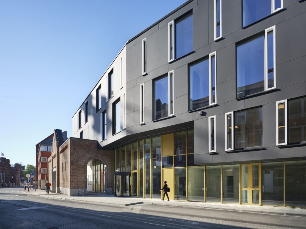 Outre les façades historiques en brique, certaines sont enduites de blanc et d’autres sont dans un ton gris anthracite. Les façades grises sont pourvues de grandes baies vitrées qui évoquent des touches de piano. Selon les architectes, ces tonalités très contrastées expriment la diversité du programme. Les volumes blancs accueillent les salles de représentation. L’enduit blanc réfléchit la lumière et renvoie la chaleur. Il permet de mettre les salles à l’abri des perturbations extérieures (bruit ou lumière). Les façades de ton gris anthracite largement vitrées et ouvertes sur l’extérieur abritent les bureaux, les classes et les locaux de service. La teinte et les proportions des baies vitrées rendent ces activités lisibles depuis l’espace public. Bien qu’expressif, le nouveau bâtiment s’intègre subtilement dans le centre urbain.