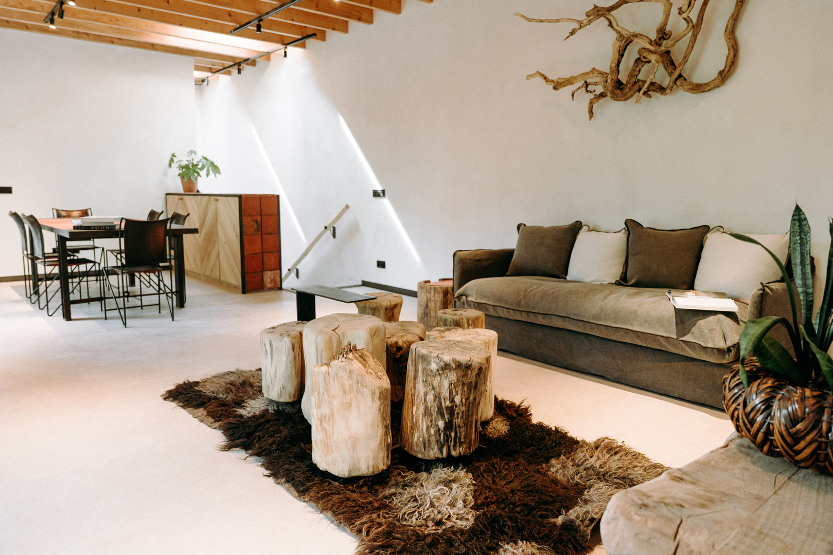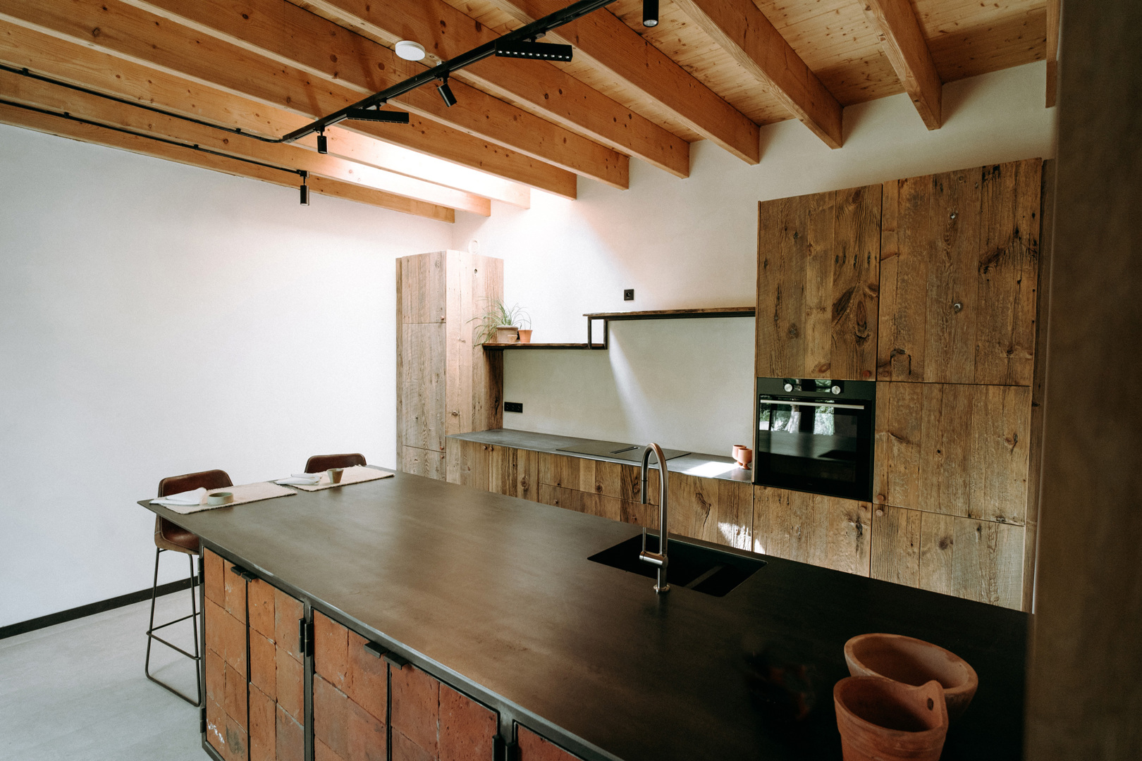 - Le mobilier original de la Wagenhuys rénovée a été fabriqué par Be Factory à partir, entre autres, de peau de mouton feutrée, de torchis et de matériaux locaux comme le bois et le métal.
