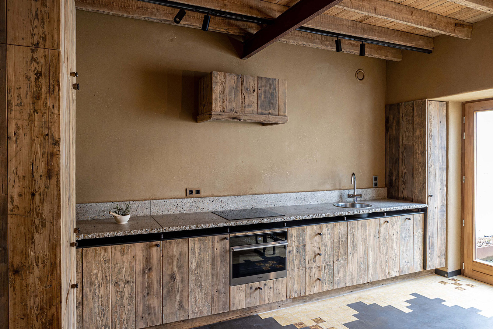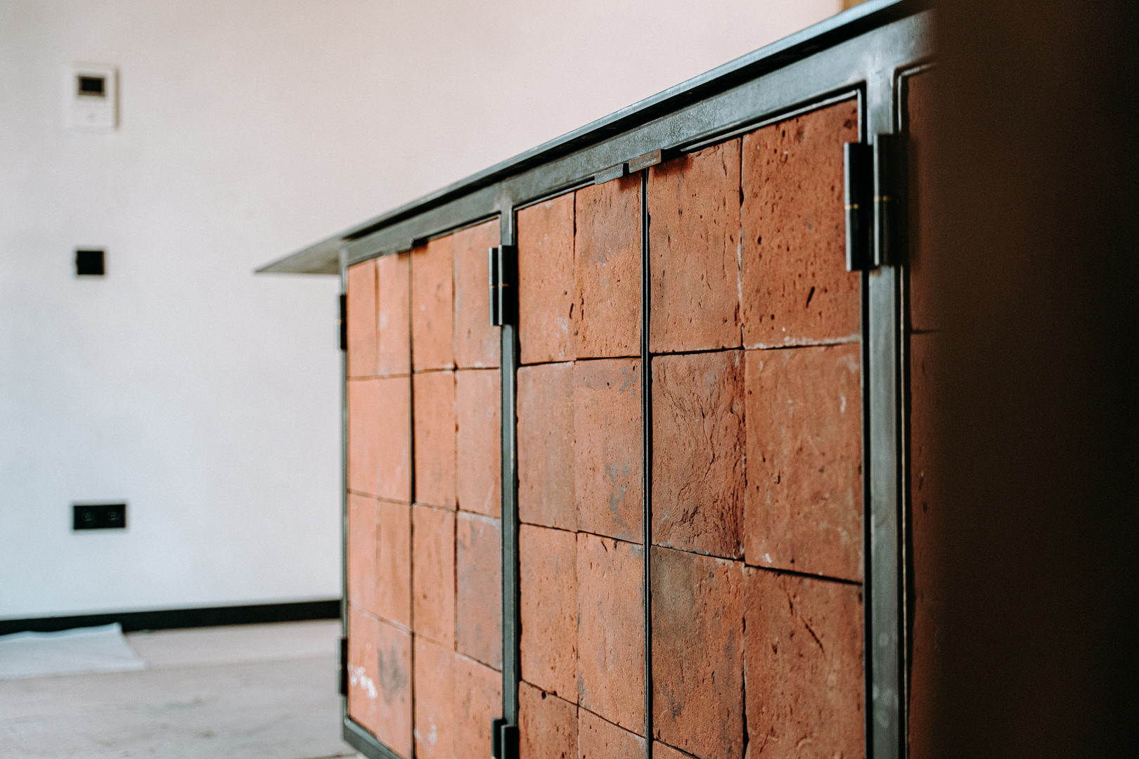 - Les carreaux de terre cuite du sol d'origine ont été réutilisés comme devant de placards.